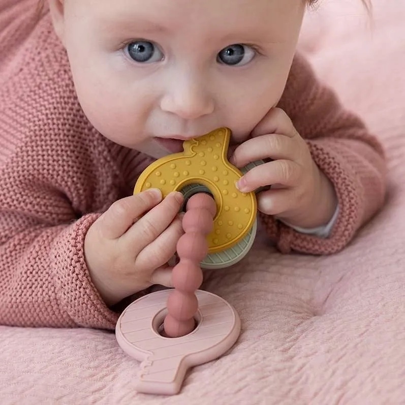 I Little Dutch Nycklar-tuggleksak finns det mycket att utforska för små händer! Nyckeltuggorna är i mjuka och behagliga färger samt har olika texturer på varje nyckel.