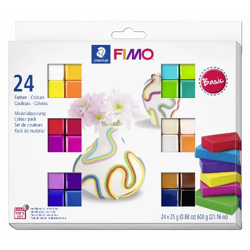 FIMO® SOFT "BASIC COLOURS" med 24 block à 25 g i olika färger. FIMO®soft är en mjuk och flexibel lera som är lätt att arbeta med. Speciellt för nybörjare och hobbyentusiaster. FIMO®soft kan blandas med FIMO®effect och FIMO®professional. Med FIMO kan du vara kreativ och göra egna smycken, små figurer, figurer till kylskåpsmagneter m.m. FIMO kan användas till otroligt mycket och när du har gjort din dekoration behöver den bara härdas i ugnen i 110 °C i 30 min. Instruktioner i förpackningen.