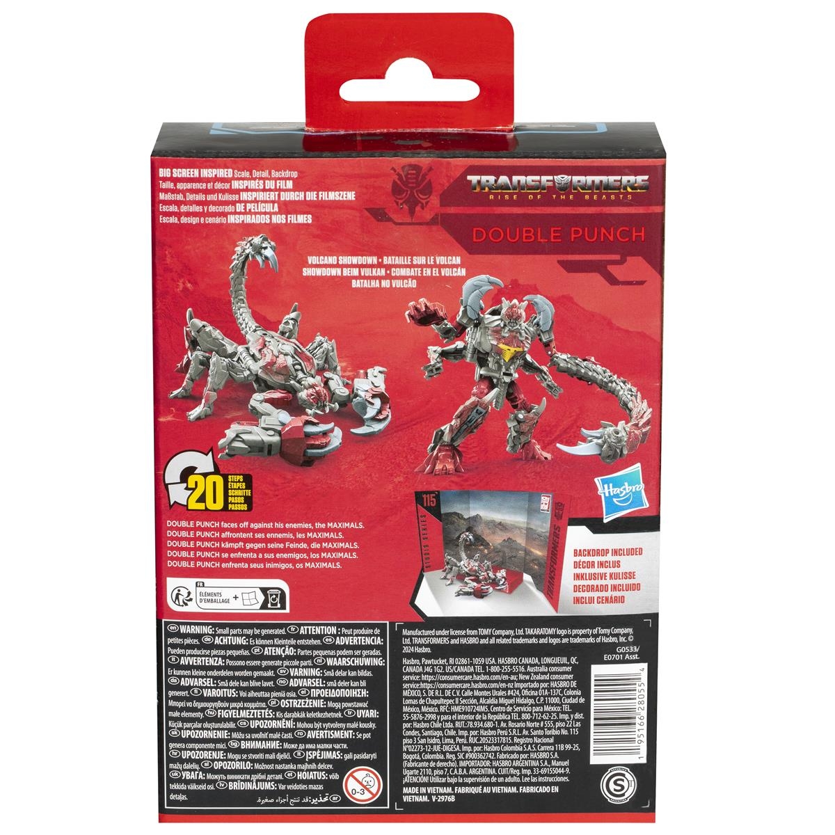 Upplev spänningen i Transformers-filmerna med Studio Series Deluxe Class Double Punch actionfigur. Den här samlarfiguren är inspirerad av Transformers: Rise of the Beasts och gör att du kan återskapa episka scener från filmen. Förvandla figuren från robot till skorpionläge i 20 steg och visa den med den medföljande Volcano Showdown-bakgrunden för en uppslukande upplevelse.