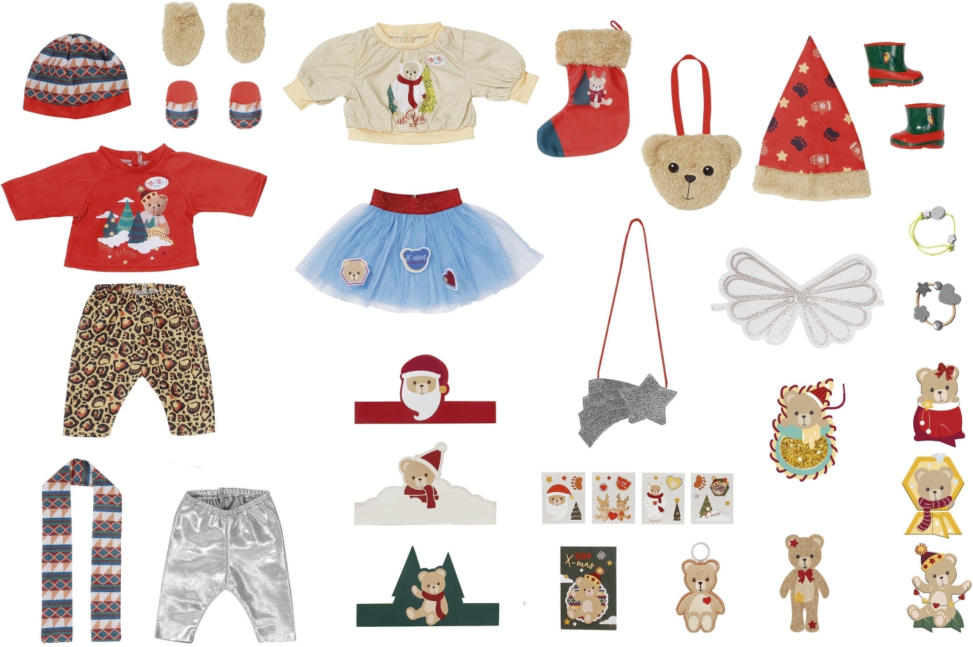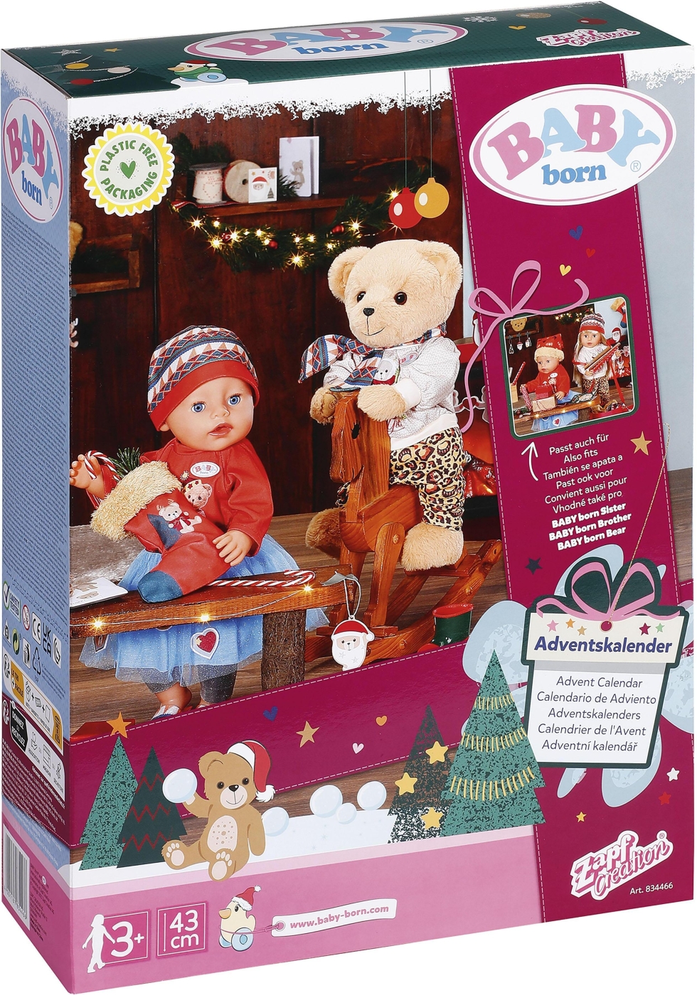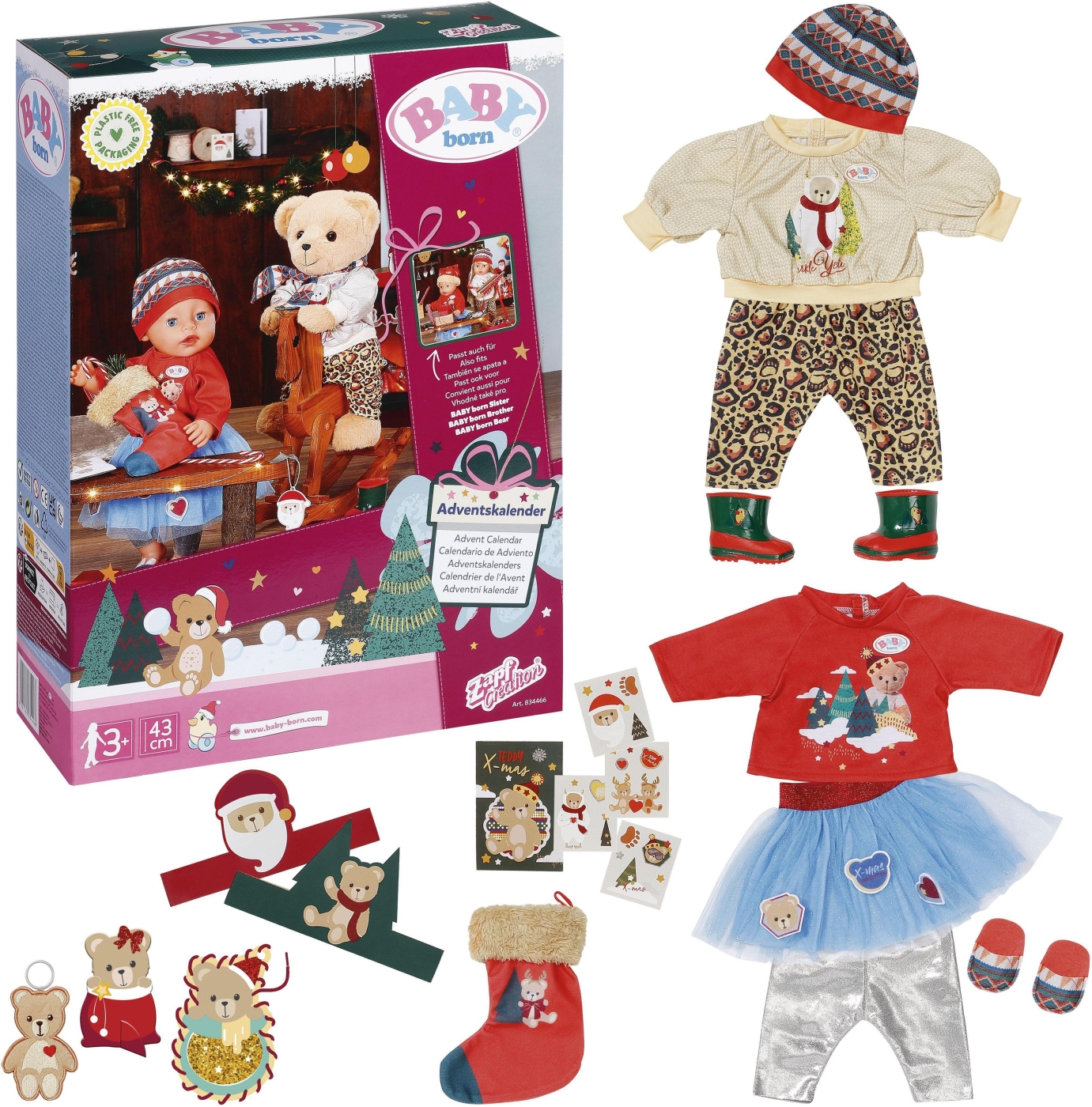 Att vänta på julen är en magisk tid för ett barn. Med Baby Born julkalendern med nallebjörnstema kan barnet njuta av julens magi under hela december. Baby Born julkalendern är full av härliga överraskningar för 43 cm Baby Born docka. Inkluderat är 24 luckor, vars insida avslöjar ett brett utbud av söta kläder, söta accessoarer och praktiska tillbehör för att underlätta väntan på jul.