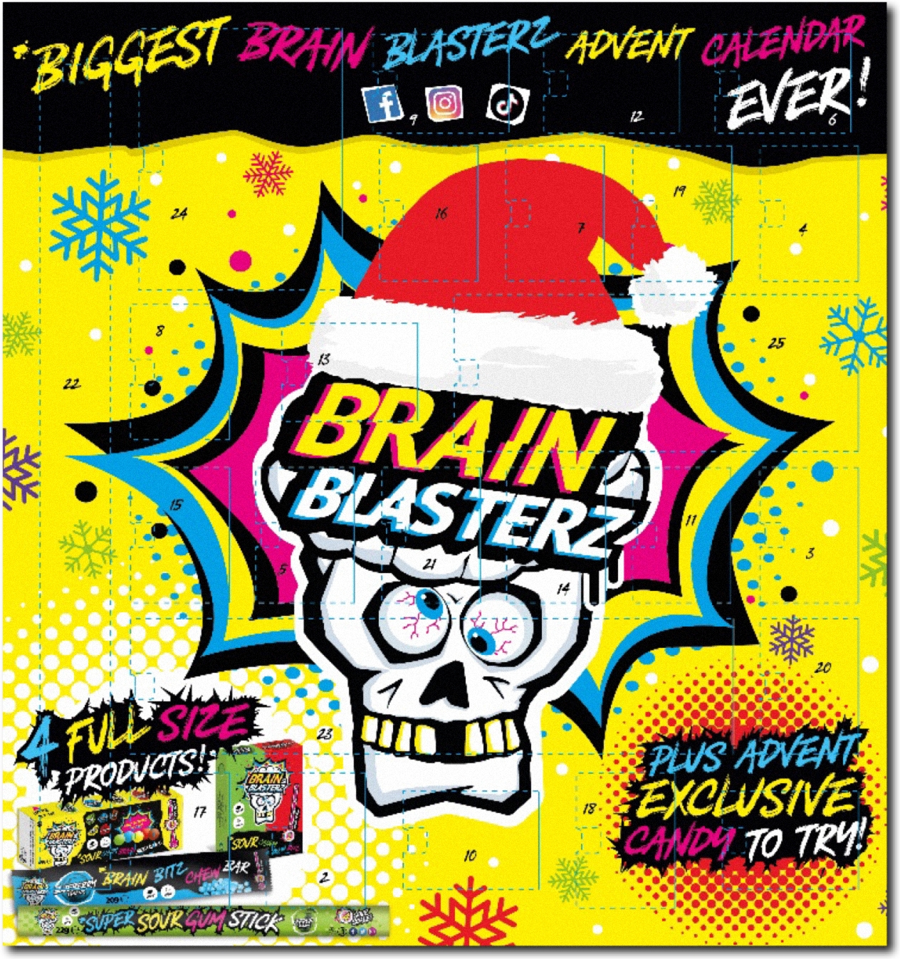 Snygga Brain Blasterz-godisar för julens väntan! Varje lucka i Brain Blasterz julkalender gömmer bakom sig ett supersyrligt Brain Blasterz-godis - Vågar du smaka på det? Brain Blasterz-kalendern är ett kantigare alternativ till den traditionella julkalendern med choklad.