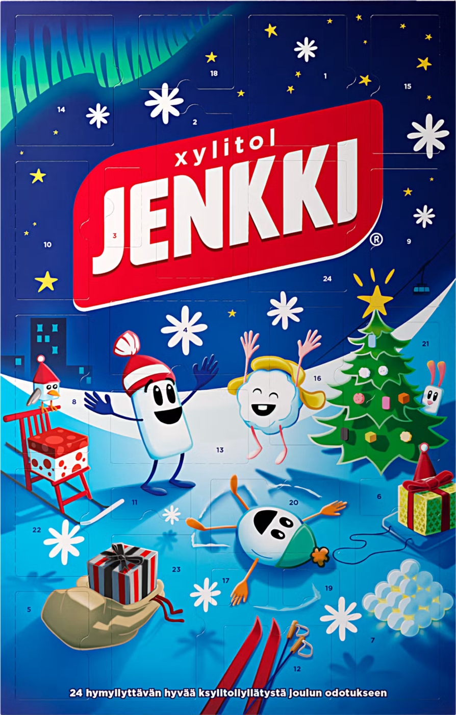 Leende bra för tänderna – även i juletid! Jenkki Xylitol julkalendern är ett fräscht alternativ till traditionella julkalendrar. Xylitolkalendern innehåller Cloettas populära mjuka pastiller och Jenkkis tuggummi. Jenkkis xylitolprodukter har Finlands Tandläkarförbunds rekommendationsmärke.