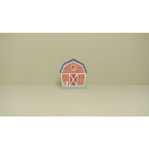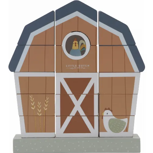 Den stapelbara bondgården är en rolig bondgård där du placerar träklossarna i rätt ordning och det blir en rolig bondgård med en tupp som kikar ut genom det övre fönstret och en höna som vaktar huset vid dörren.