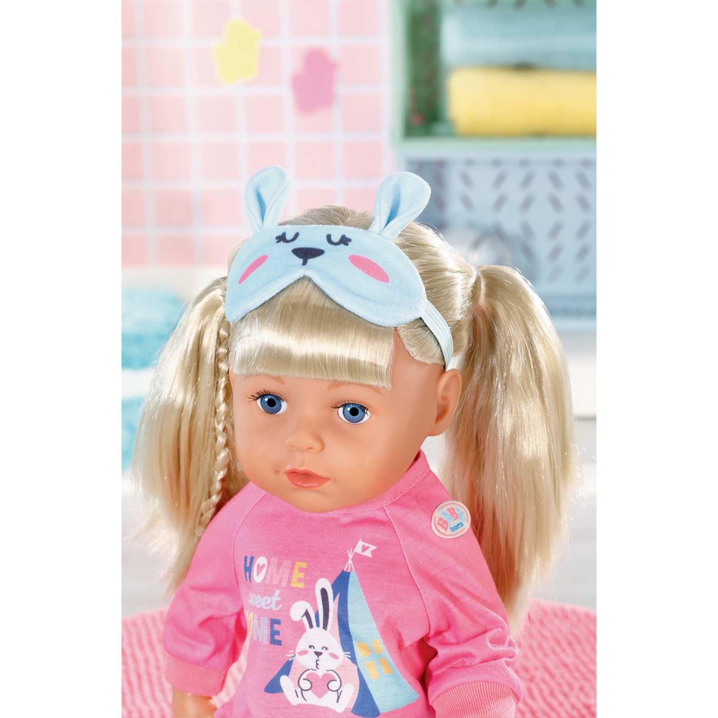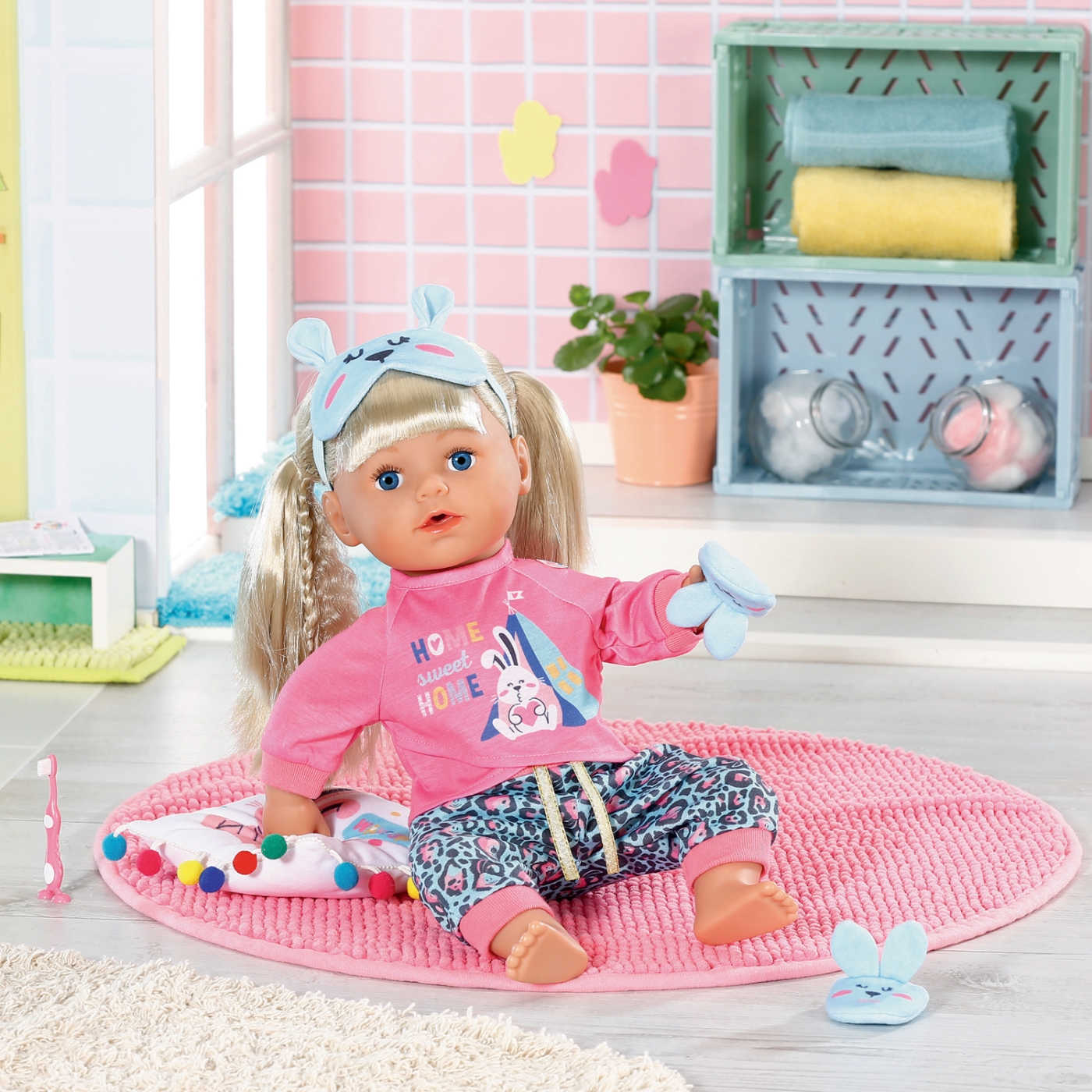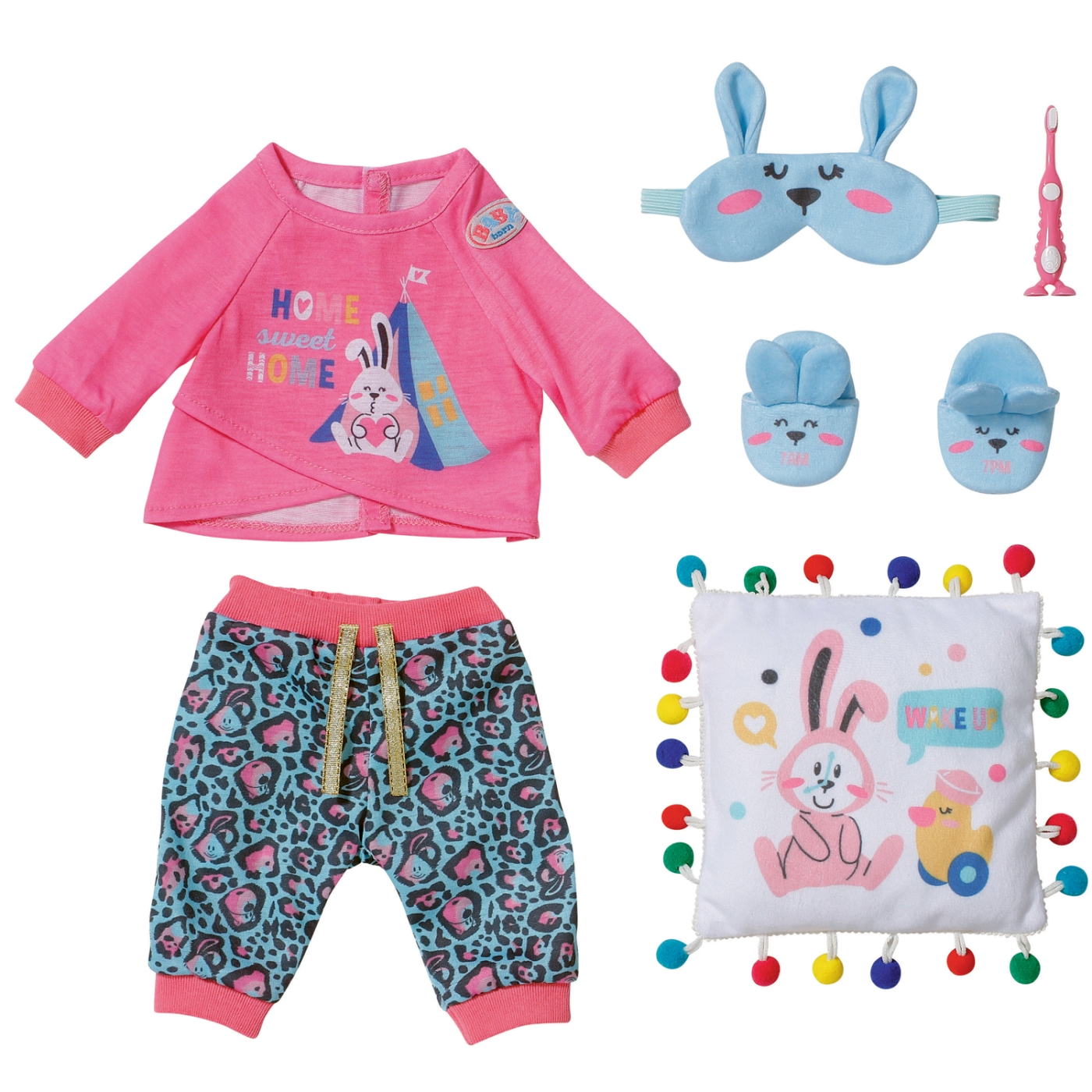 Nu är det dags att borsta tänderna med den rosa tandborsten och få på henne pyjamasen. Den bekväma, långärmade tröjan har raffinerad söm På det rosa tyget finns det tryck med Kaninen Benno som verkar se fram till att tillbringa natten på camping. Den lilla sömntutan matchar det med turkosa byxor i ett annorlunda mönster. Hennes tofflor och blå sovmask är dekorerad med ett kaninansikte och söta små öron. Nu är BABY born redo till att göra det skönt för sig på kudden med de färgrika bubblorna. God natt!