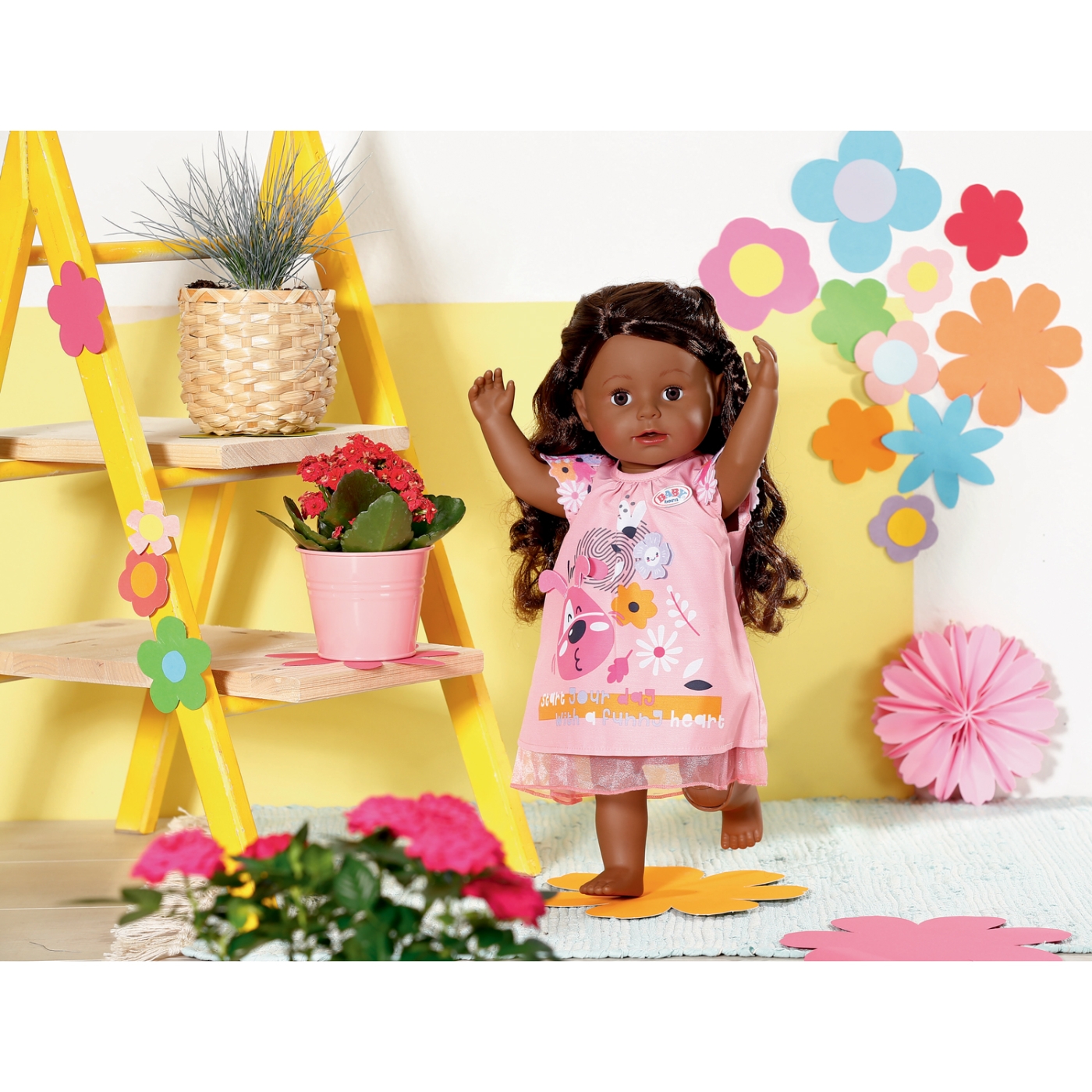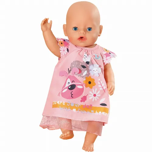 Men när du tittar lite närmare, ser du flera detaljer på den rosa klänningen: ärmarna är inte riktiga ärmar, utan en konstgjord blombukett. Ett lager av tyll tittar fram under den nedersta kanten på klänningen, som får det till att se ut som om BABY born har en underkjol på sig. Och den lilafärgade blomman på bröstet är en applikation