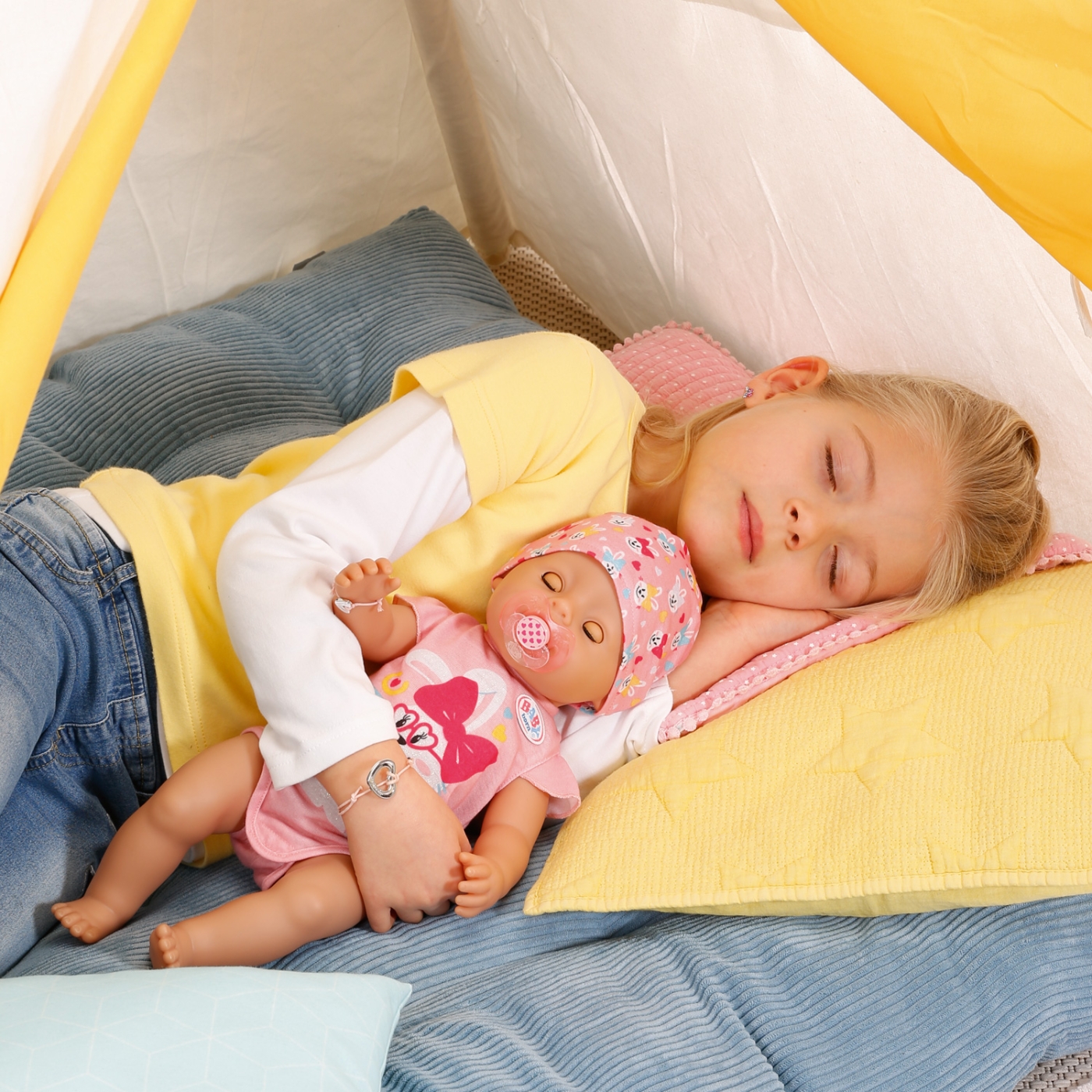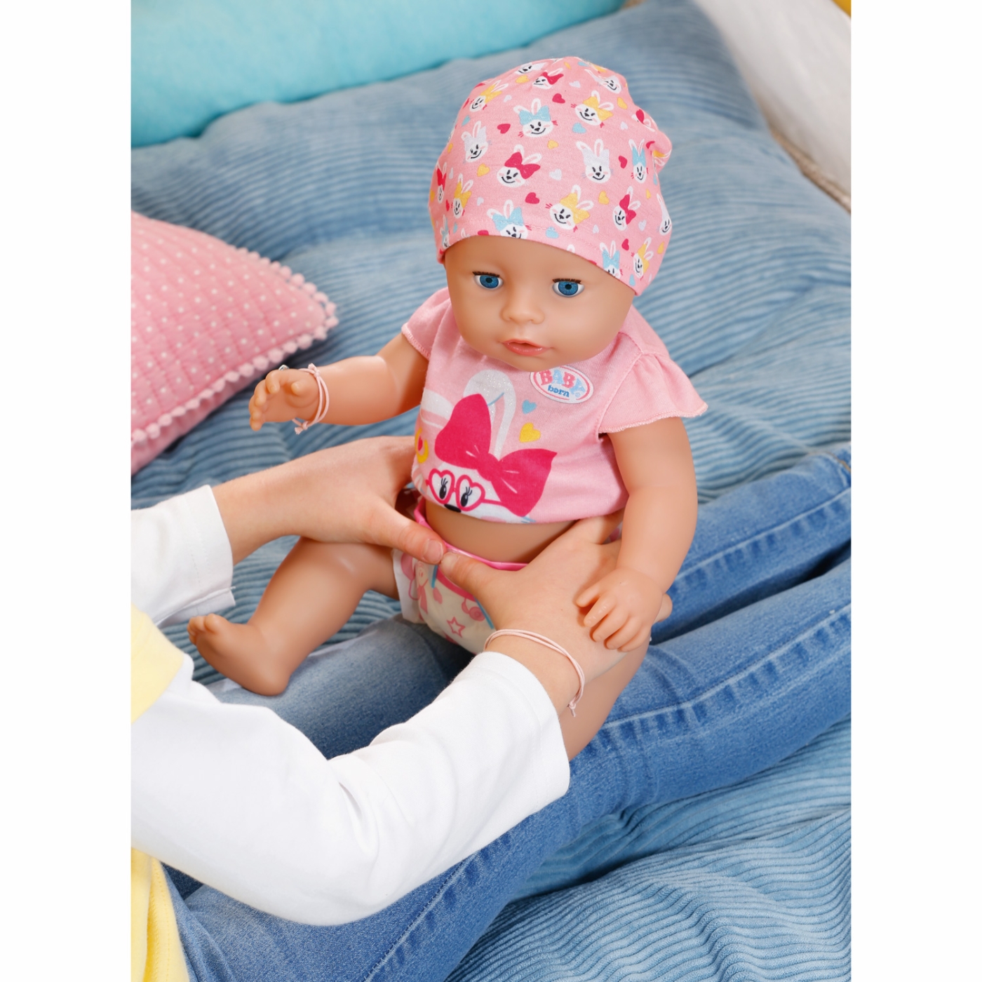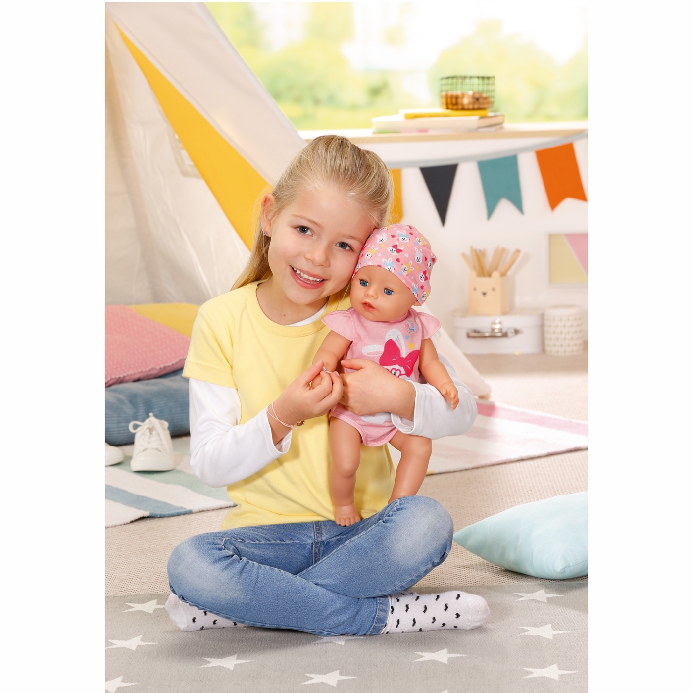 Den lilla tjejen har också sovögon: Om du lägger henne på ryggen utan hennes napp, stänger hon automatiskt ögonen. Hennes favoritsysselsättningar är att sova, äta och bada. Hon älskar att dricka vatten från sin flaska. Så kan hon kissa i blöjan eller pottan och gråta riktiga tårar. Förutom att dricka vatten, kan BABY born också äta gröt. Och hon kan också bajsa korvar. Hennes armar, ben och huvud är extremt rörliga, så det är en riktig barnlek att ge henne det stiliga kläder på och ta av det igen. Soft Touch-kroppen är mjuk och härlig.