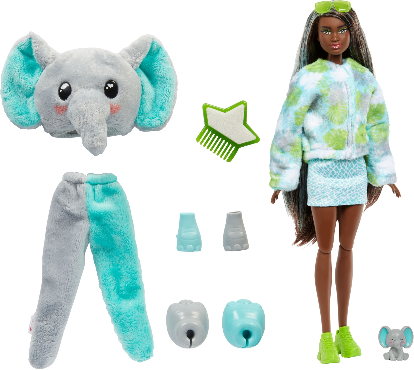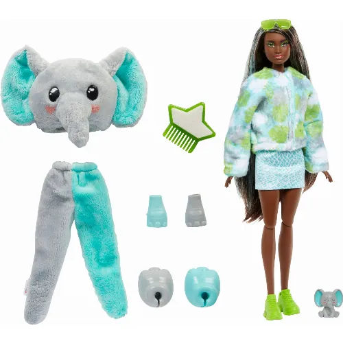 Förpackningen avslöjar en gigantisk, underbart mjuk djungelelefant! Ta av dig den fluffiga dräkten och bli överraskad vem som kommer att avslöjas under den! Barbie-dockan har en outfit som matchar djungeltema och härliga överraskningar, varav två byter färg.