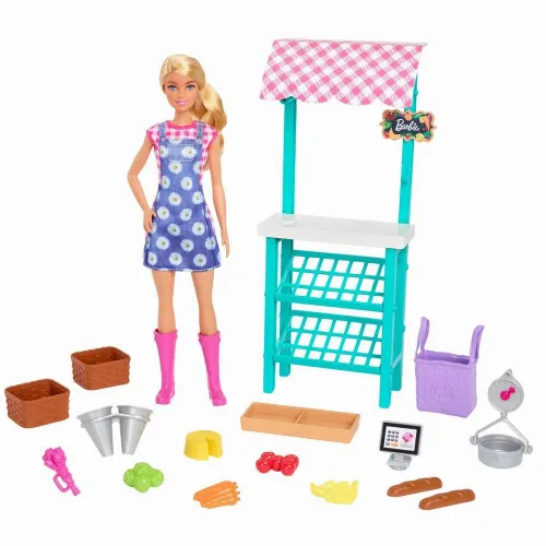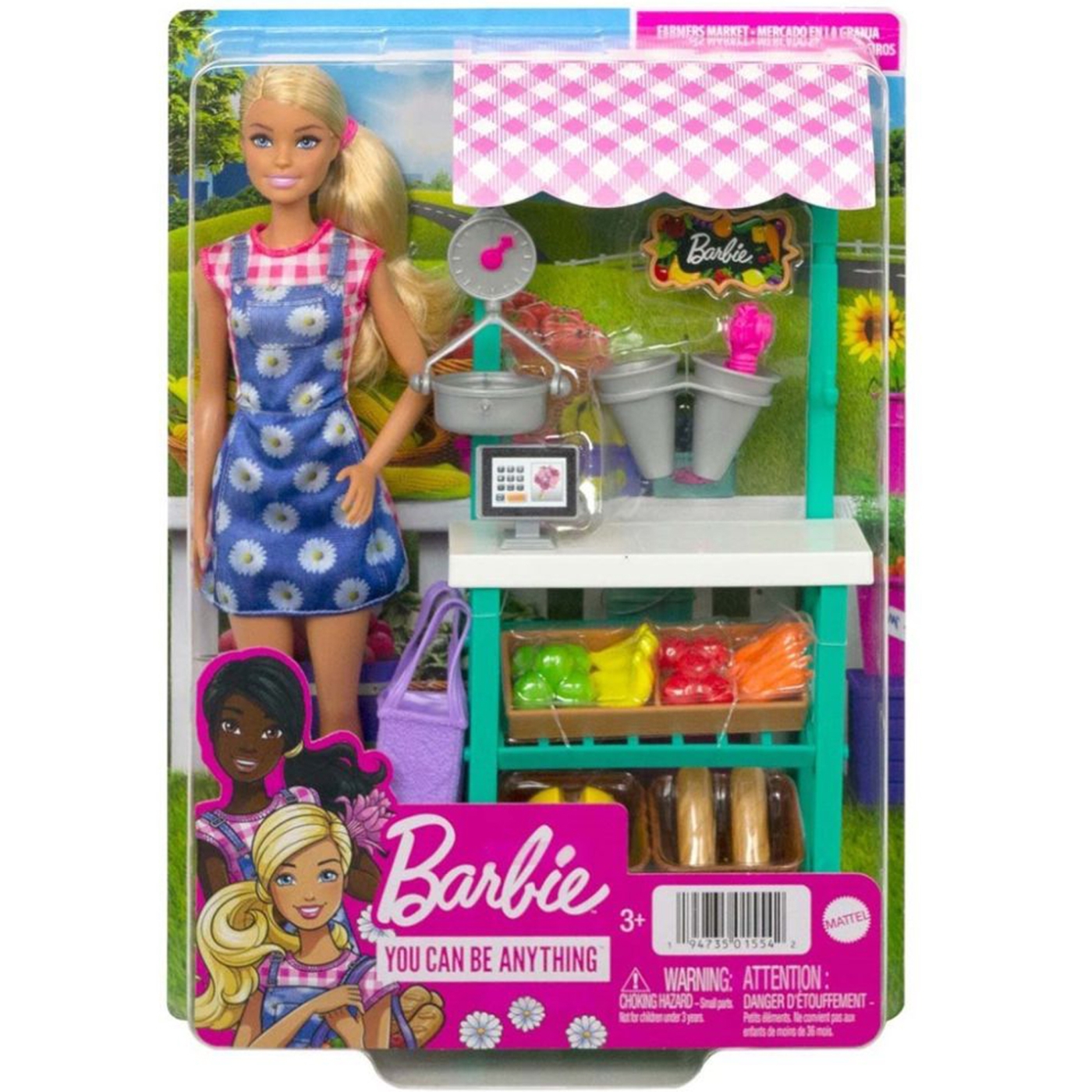Barbiedockan® kan väga varorna på en våg med riktiga rörliga knappar, och hon kan lägga den i påsar för kunder och slå den i kassan Delarna för berättande inkluderar ett marknadsstånd, frukt, grönsaker, ost, bröd, blommor, shoppingväska och kassaapparat.