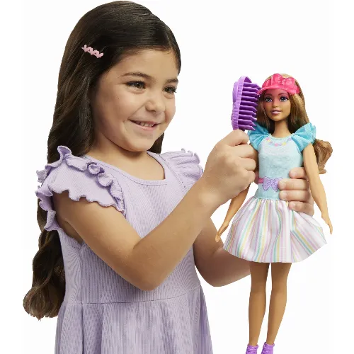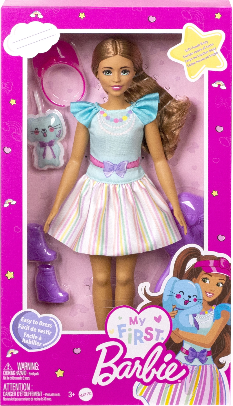 Den första dockan för yngre Barbie-fans är My First Barbie! Dockan har mjukare hud och är lättare för små händer att hantera och klä på sig. Denna docka har en snygg blommig klänning, en söt kaninplysch och en hårborste.
