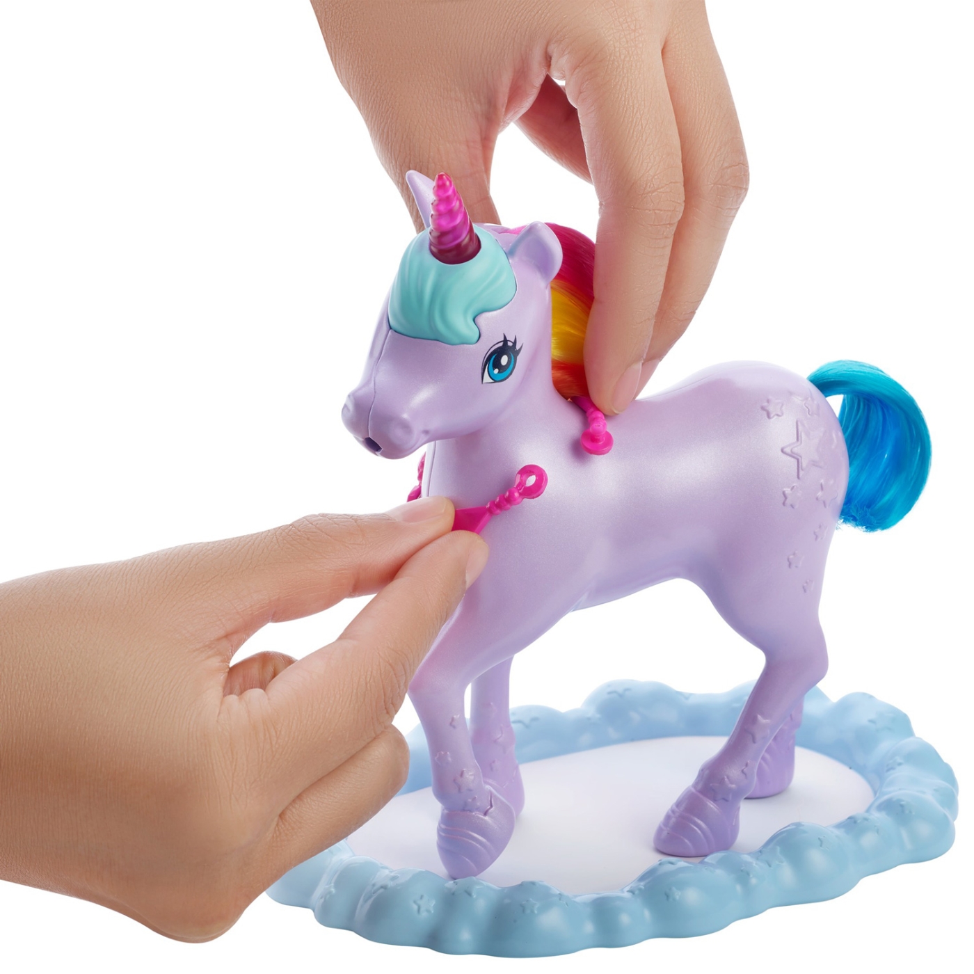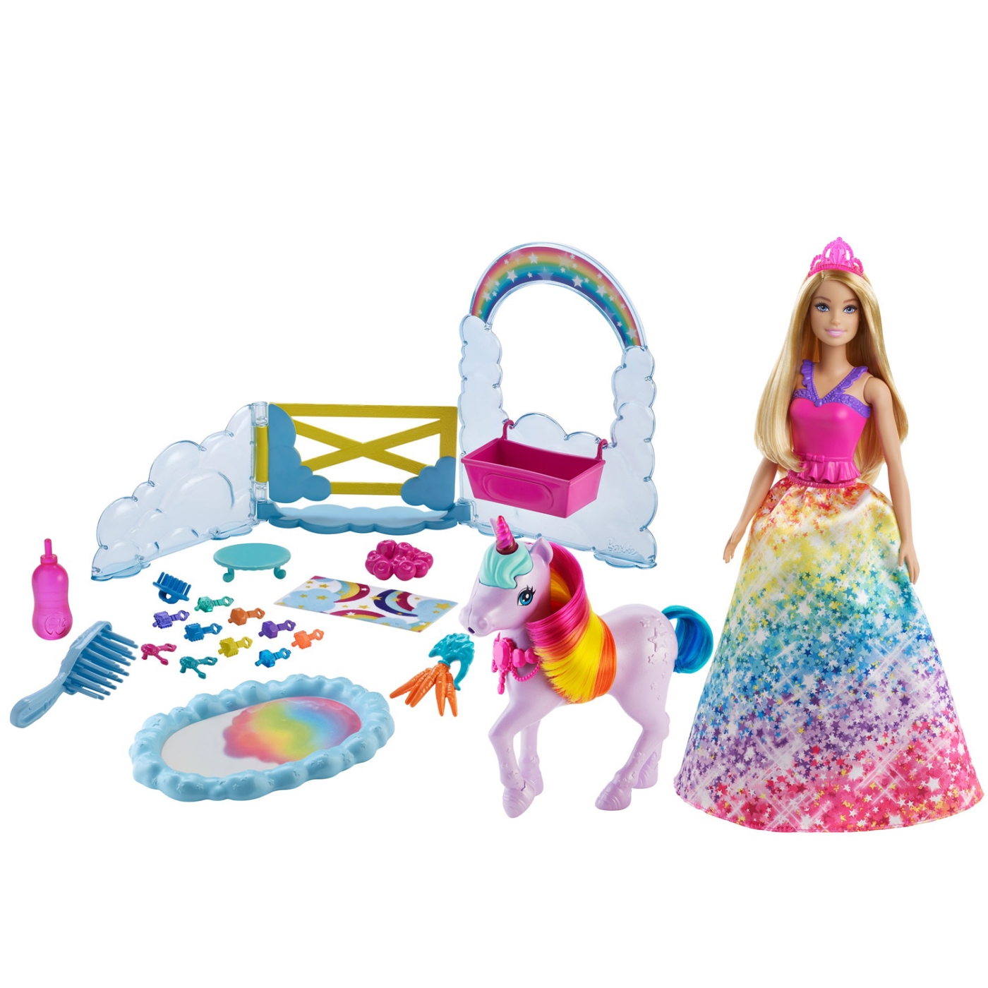 Det fantasifulla stallet, inspirerat av moln och regnbågar, är den perfekta platsen för Barbie®-dockan att sköta om sin enhörning. Fyll flaskan med vatten, sätt bebisenhörningen på dynan och hjälp Barbie®-dockan mata sitt husdjur. När enhörningen ”kissat” ändras färgen på dynan från vit till regnbågsfärgad! Låt den torka, och upprepa sedan om och om igen. Bland de andra lekdelarna finns ett tråg och snacks, en hårborste för Barbie®-dockan, en borste åt hennes enhörning och 10 andra tillbehör för roliga lekar och styling. Med sin magiska färgförändringsfunktion och så många tillbehör blir det här leksetet med Barbie®-prinsessdocka och enhörning den perfekta presenten för alla barn som är 3 till 7 år.