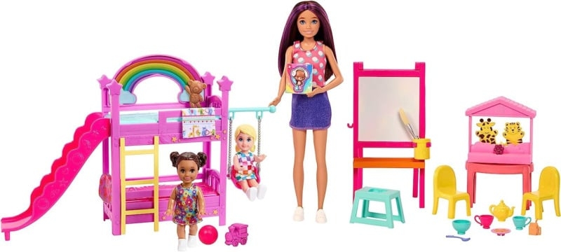 Barbie® Skipper Babysitters Inc. dockor och lekset låter barnen utforska arbetslivet med tonårssystern till Barbie®. Inspirerat av filmen Skipper and the Big Babysitting Adventure, innehåller detta set det ultimata daghemmet med Skipper&trade-dockan som vårdare, två småbarnsdockor, möbler och mer än 15 tematillbehör. Barnen kan leka alla möjliga aktiviteter - måla en vacker tavla vid staffliet, sitta ner vid bordet för en tebjudning, sätta upp en dockteater, gunga, rutscha och sedan göra sig redo för en tupplur i våningssängarna. Med så mycket som stimulerar fantasin är det här leksetet en utmärkt present till barn och unga vårdnadshavare från 3 år och uppåt. Dockorna kan inte stå ensamma. Färger och dekorationer kan variera.