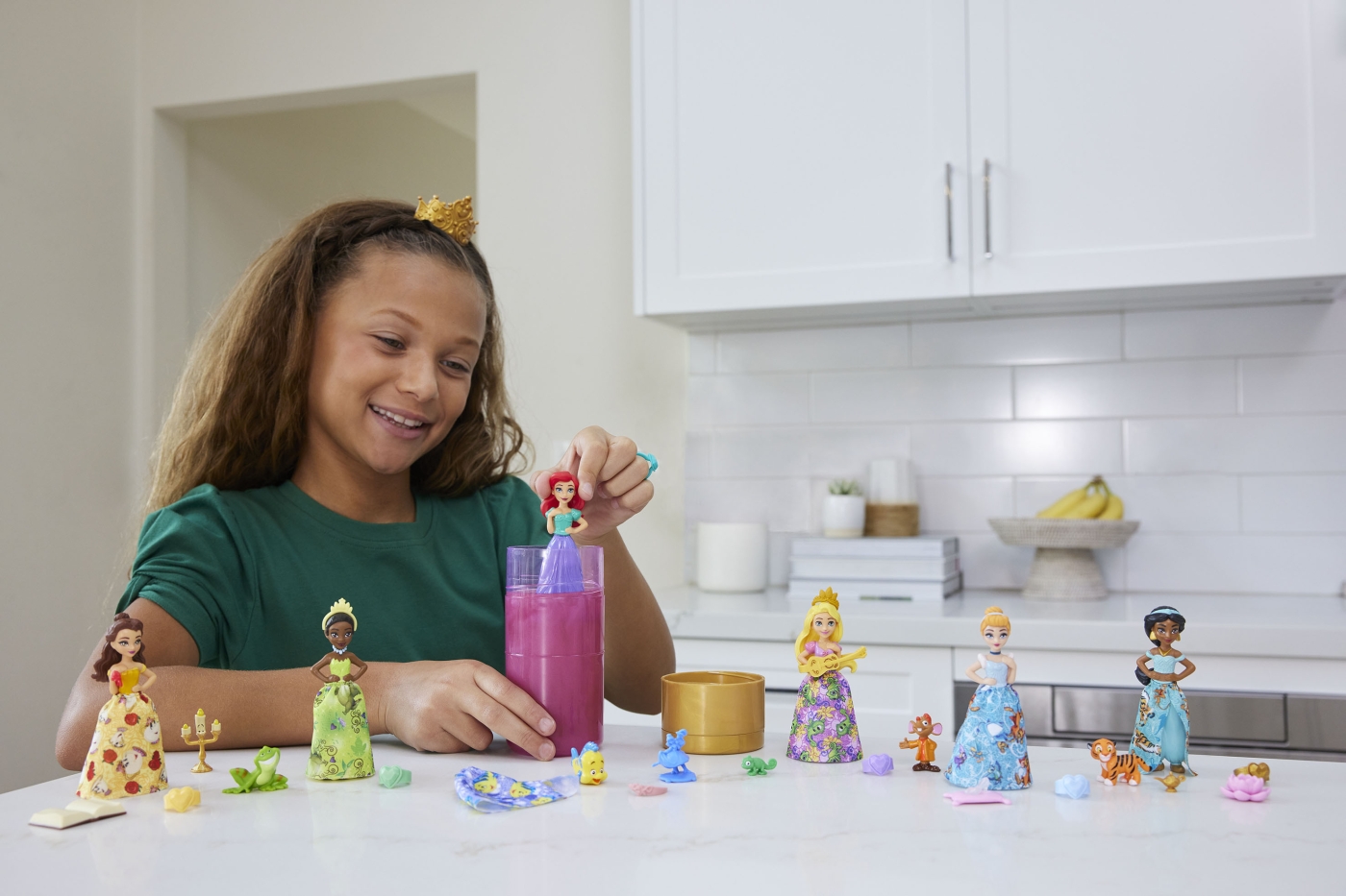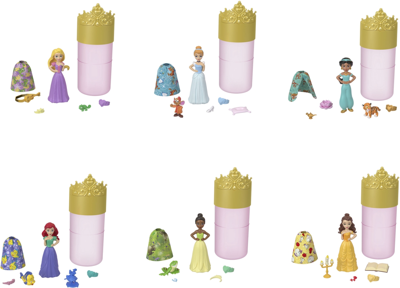 Vem är den ljuvliga Disneyprinsessan från paketet avslöjat? Skölj färgen med vatten och dockan är redo för sagospel. Det finns även andra underbara överraskningar som kompletterar sagospelen! Sex olika dockor att samla.