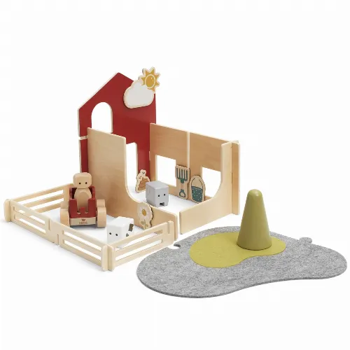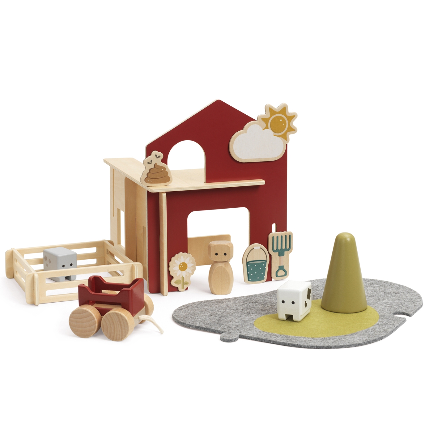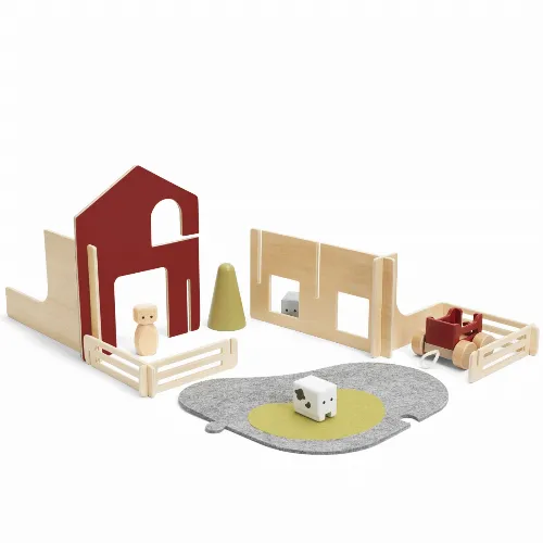 De enkla formerna och de abstrakta figurerna skapar förutsättningar för att enkelt bygga upp sin egen fantasivärld - liten som stor. Kanske börjar leken runt bondgården, men efterhand kan fantasin få världen att växa och bli något helt annat?