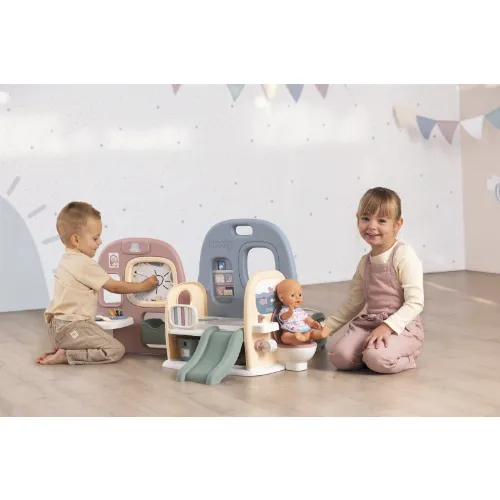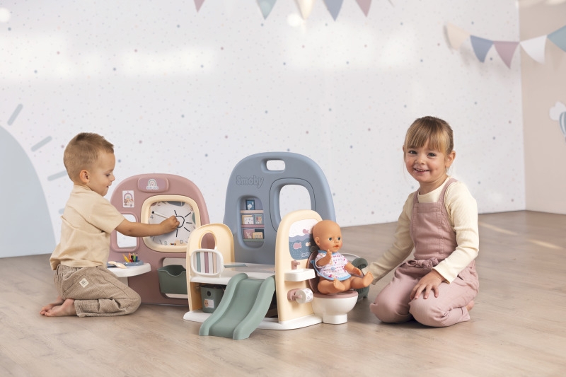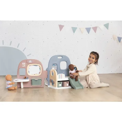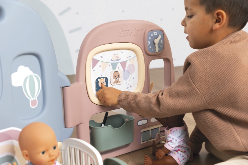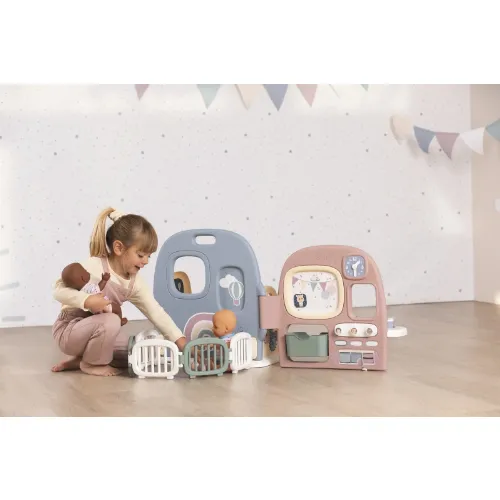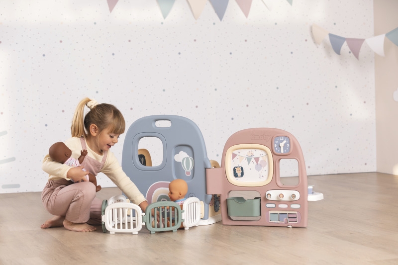 För barn från 3 år och uppåt erbjuder det förtrollande dockrummet Smoby Baby Care en enorm lekvärld för dockor, skapad för att återskapa vardagslivet i barnrummet. Dockkammaren har fem olika områden och möjliggör lek i alla riktningar.