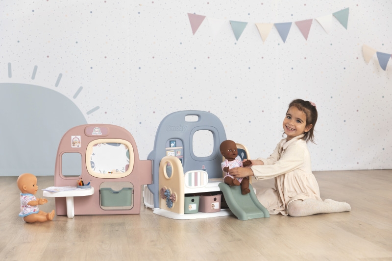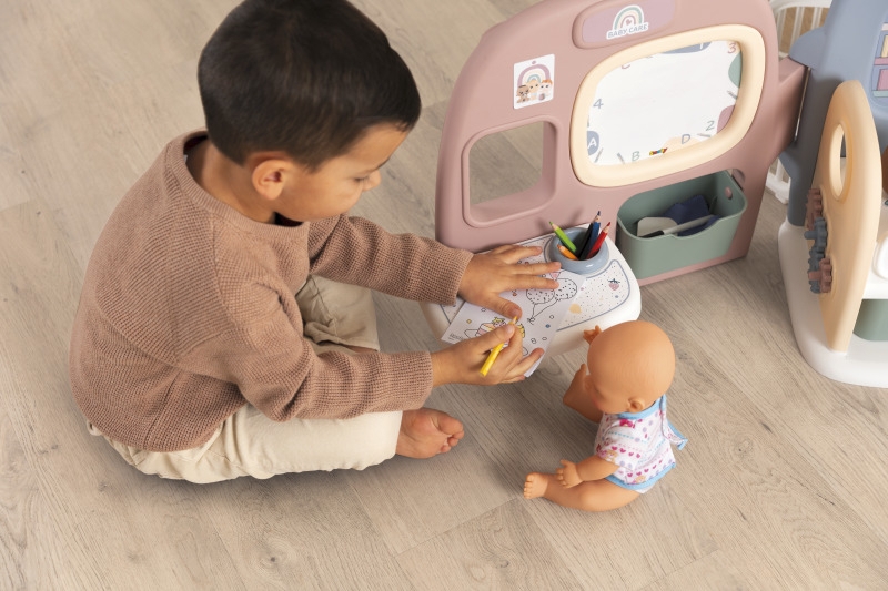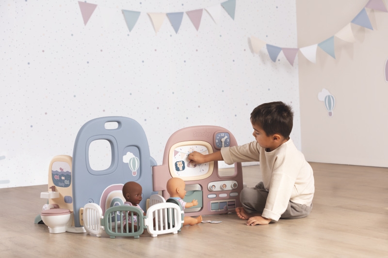 Baby Care barnkammaren kan enkelt fällas ihop och förvaras med hjälp av hopfällningsmekanismen och bärhandtaget när leken är över. Många tillbehör ingår, såsom 4 bollar, en tallrik, en sked, en yoghurt, ett pussel, en tuschpenna, 6 kritor, målarblock och en trasa.