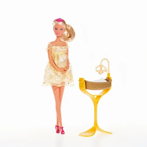 Steffi har på sig en vacker guldklänning och setet kommer med en matchande vagga och en liten mini-krona till bebisen.