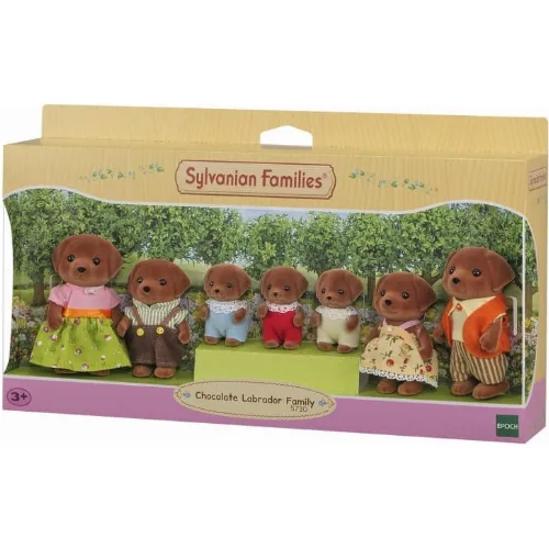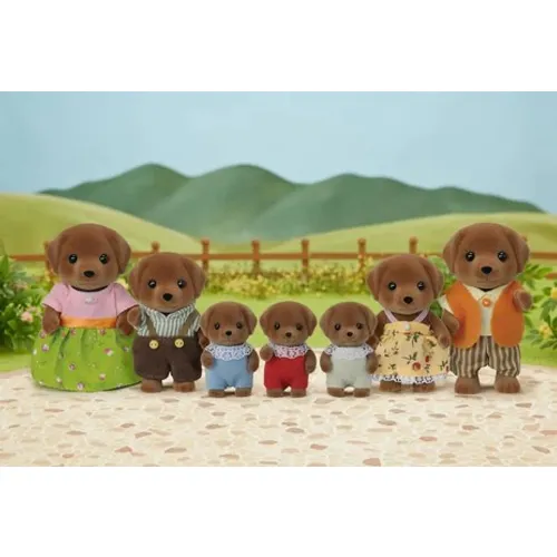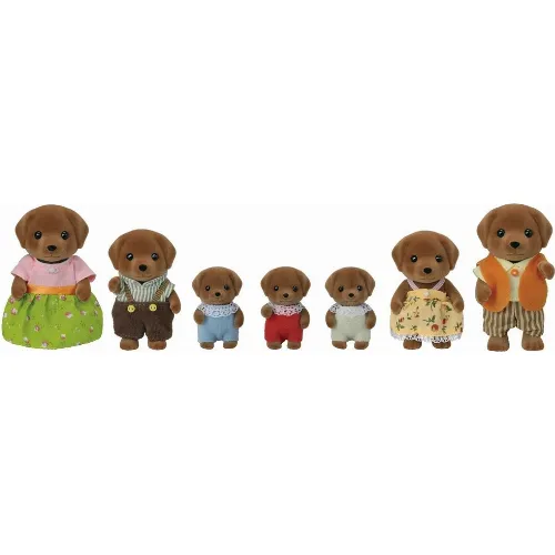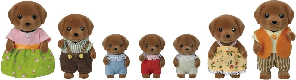 Sylvanian Chocolate Labrador Family är en riktigt stor familj med totalt 7 familjemedlemmar. Familjen består av en pappa, mamma, små trillingar, syster och bror. Figurernas huvuden, armar och ben rör sig och kläderna kan tas på och av.