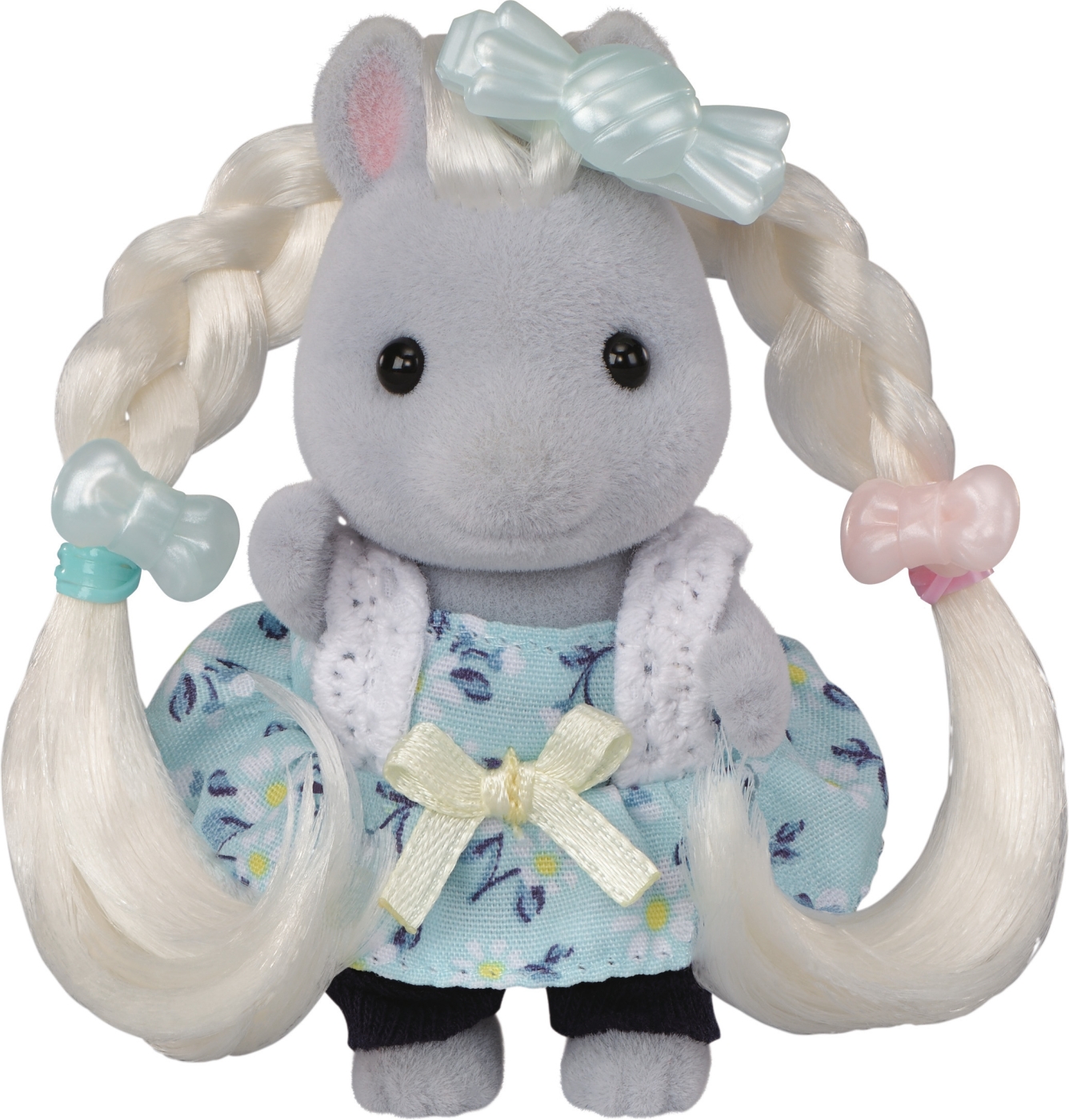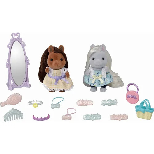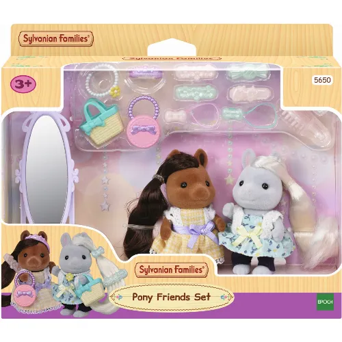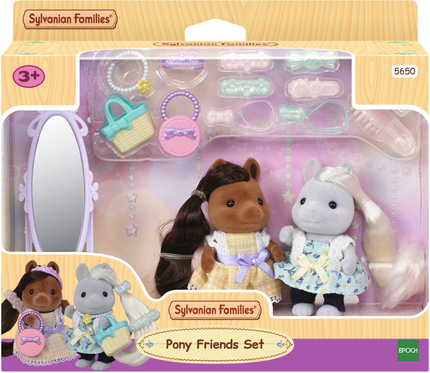 Sylvanian Families I leksetet Cute Pony Friends finns de söta ponnytjejerna Vera och Giselle, som är bästa vänner. De älskar att kamma varandras hår. Deras hår kan kammas, flätas eller dekoreras med hårsnoddar och en krona. Resultatet blir alltid nya och trendiga frisyrer. Sylvanian Families De kan sedan beundra de färdiga frisyrerna i spegeln. Cute Pony Friends lekset innehåller en golvspegel, kam, borste, krona, hårspännen, hårsnoddar, handväskor och två ponnyflicksfigurer vars hår kan kammas. Den bruna ponnyflickan Vera har klänning på sig. Giselle, den silverfärgade ponnyflickan, har byxor och blus på sig. De sammetslena figurerna är ca 6 cm stora och har rörliga huvuden, armar och ben. Börja spela roliga spel med dina roliga vänner!