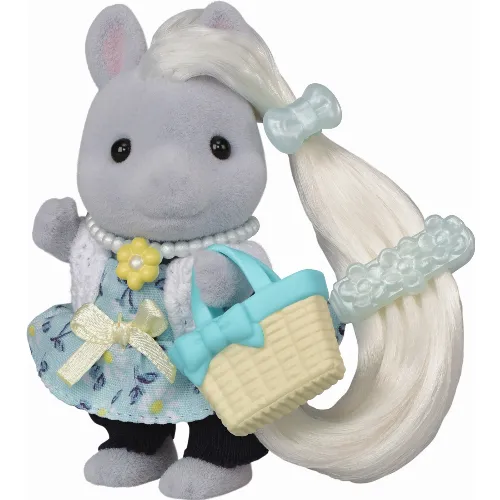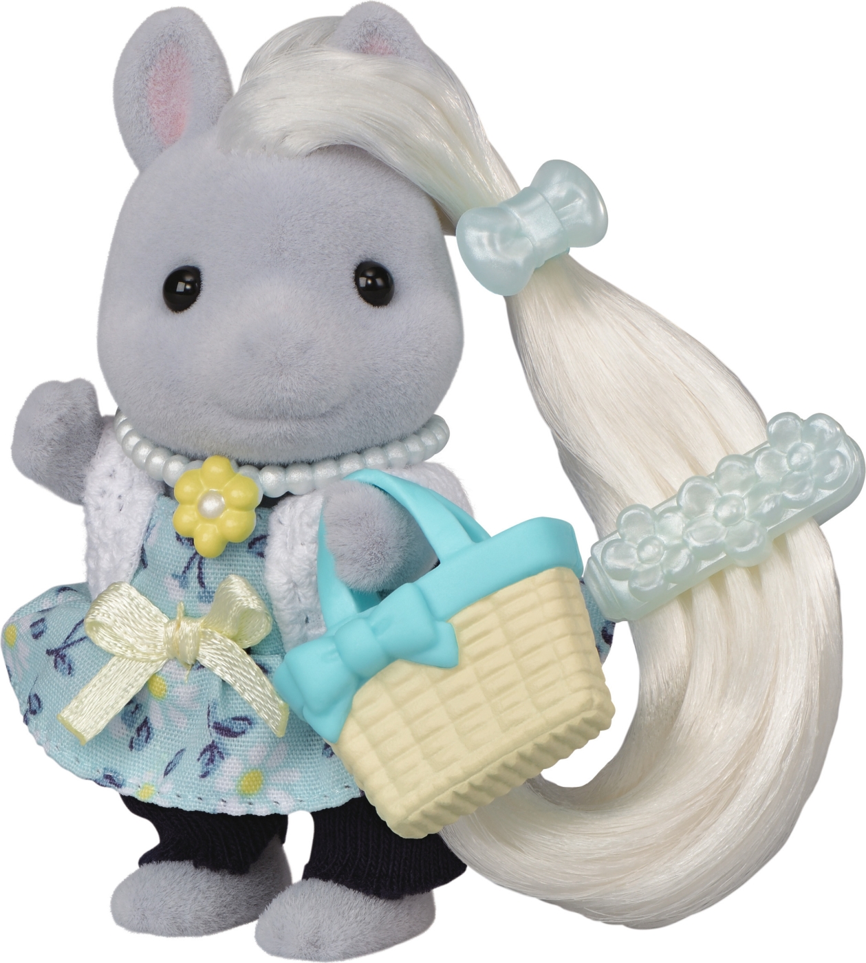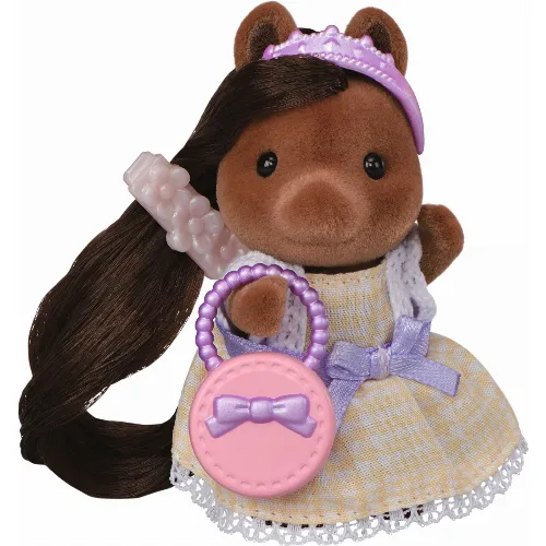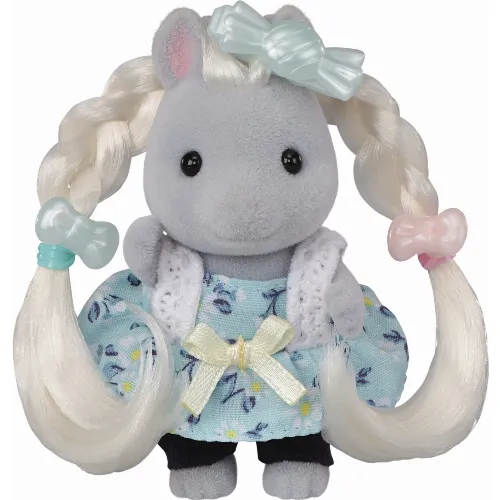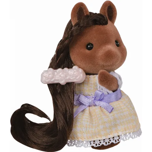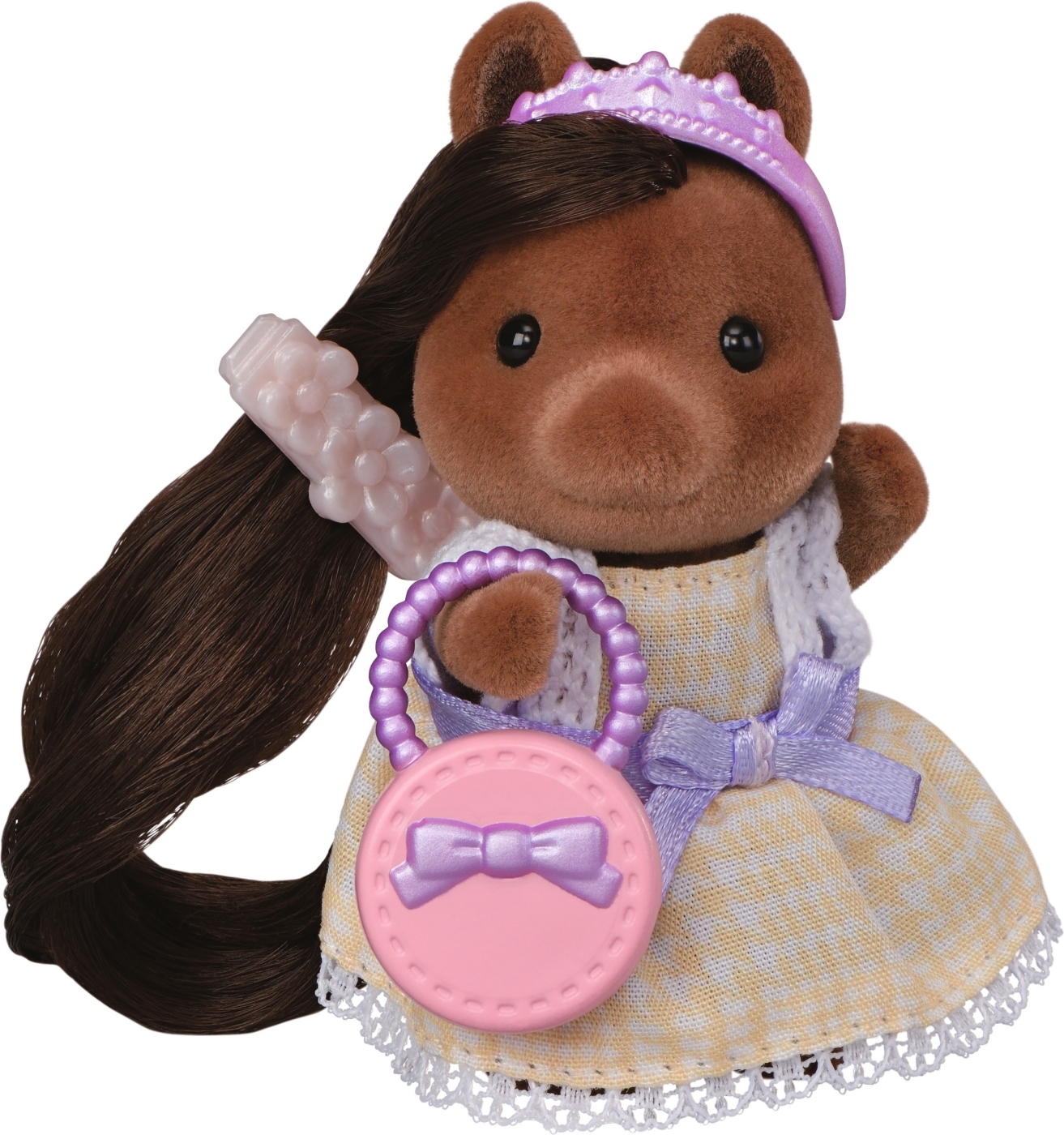 Sylvanian Families I leksetet Cute Pony Friends finns de söta ponnytjejerna Vera och Giselle, som är bästa vänner. De älskar att kamma varandras hår. Deras hår kan kammas, flätas eller dekoreras med hårsnoddar och en krona. Resultatet blir alltid nya och trendiga frisyrer. Sylvanian Families De kan sedan beundra de färdiga frisyrerna i spegeln. Cute Pony Friends lekset innehåller en golvspegel, kam, borste, krona, hårspännen, hårsnoddar, handväskor och två ponnyflicksfigurer vars hår kan kammas. Den bruna ponnyflickan Vera har klänning på sig. Giselle, den silverfärgade ponnyflickan, har byxor och blus på sig. De sammetslena figurerna är ca 6 cm stora och har rörliga huvuden, armar och ben. Börja spela roliga spel med dina roliga vänner!