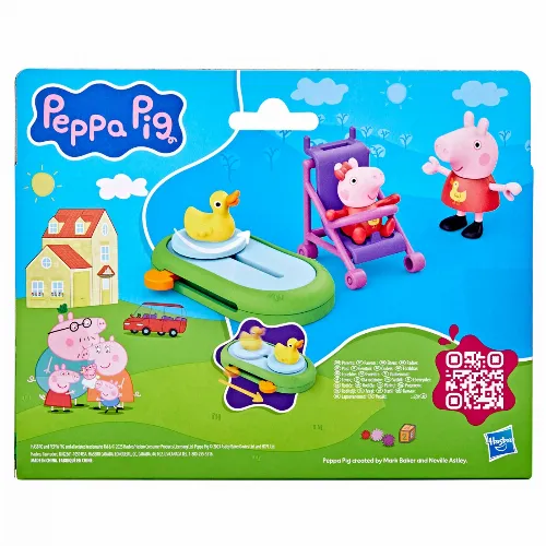 Setet innehåller två 3" figurer, Peppa och Evie, samt en barnvagn och ett tillbehör till ankdammen. Barnen kan återskapa söta scener från serien eller hitta på egna systerliga äventyr. Det här leksetet är en underbar present till barn som älskar Peppa Pig, men också en omtänksam present till nya syskon. Det är utformat för förskolebarn från 3 år och uppmuntrar till fantasifull lek och historieberättande.
