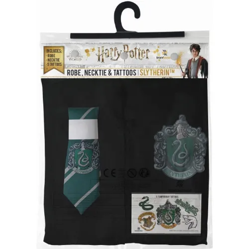 Cinereplika Harry Potter Slytherin trollkarl är den perfekta outfiten för alla Harry Potter-fans! Paketet innehåller en dräkt, en slips och en slytherin transfertatuering. Dräkten är dekorerad med Slytherin-tecken och är perfekt för till exempel maskeradfester!