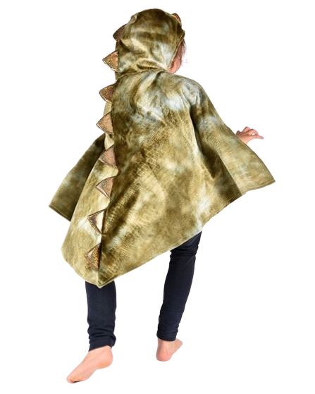 | Grön drakcape med huva. Reptilstruktur. Vadderade spikar som löper ner längs ryggen. Kardborreknäppning vid halsen. |
