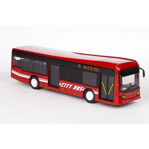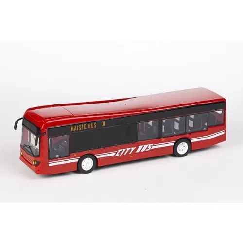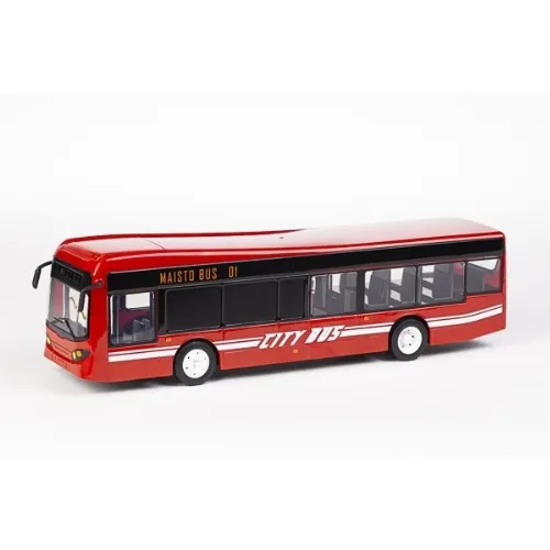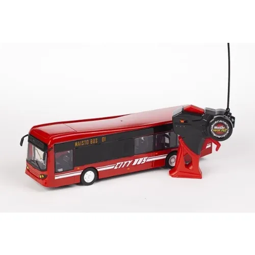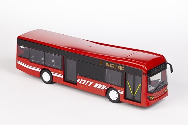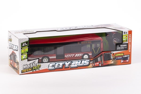 Fjärrstyrd stadsbuss. Superfin, detaljerad och välkörande modell med ljus i både toppskylt och strålkastare samt manövrering av dörrarna från fjärrkontrollen. Bussen har 27 MHz och en fjärrkontroll med tre kanaler vilket gör att tre användare kan köra samtidigt utan att signalen störs.