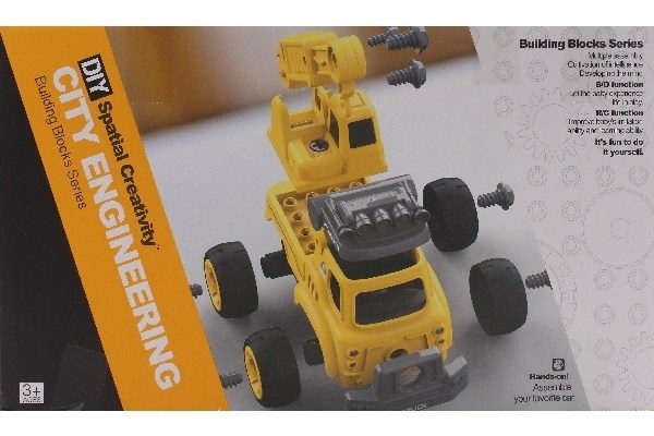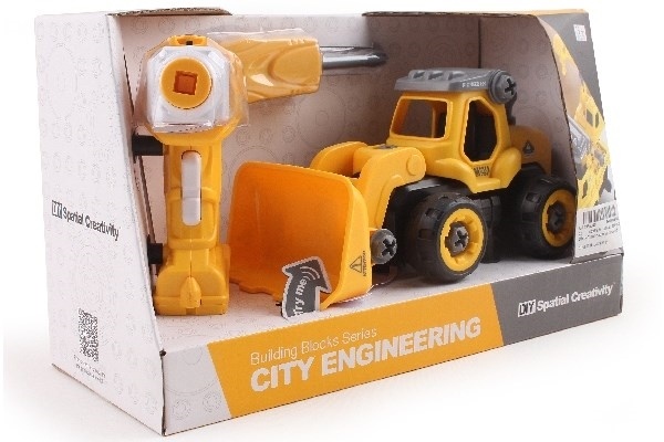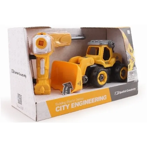 Modellen kan demonteras och monteras med det medföljande verktyget. Motorn som sitter i den medföljande skruvmaskinen kan, efter att du har satt ihop bulldozern, monteras i själva fordonet. Sedan har du en fjärrstyrd bil som är redo att köras!