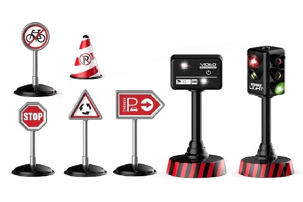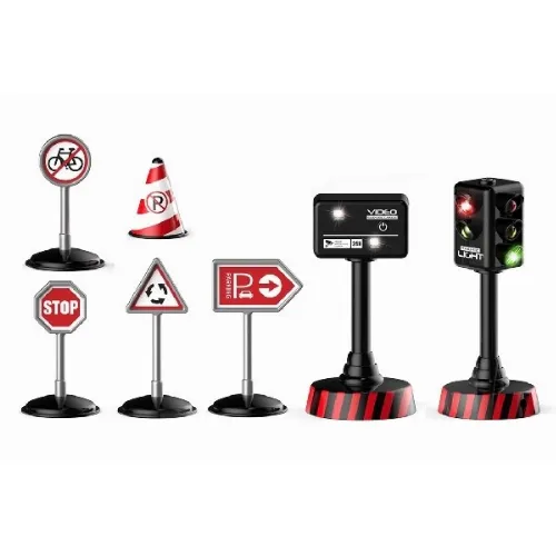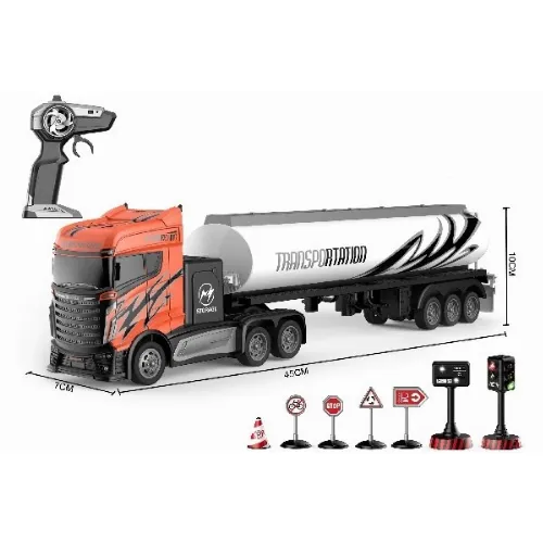 R/C lastbil i skala 1:16 med oljetank, kon, vägskyltar och ljusreglering.