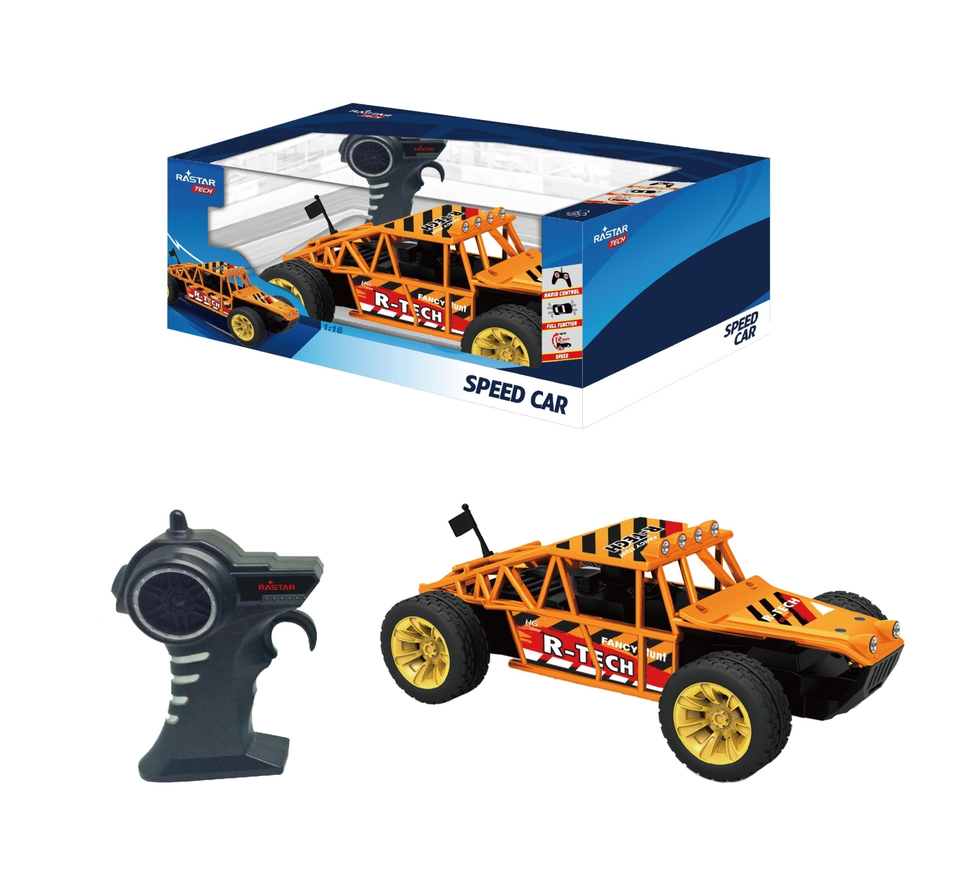 Ta kontrollen och kör iväg med den här coola offroad-buggyn med gummihjul. Den kan köra i upp till 11 km/h och kan köra framåt, bakåt och svänga åt vänster och höger. 2.4GHz transmissionsteknik gör att upp till 10 personer kan köra samtidigt utan att bli störda. Ålder 8 år och uppåt.