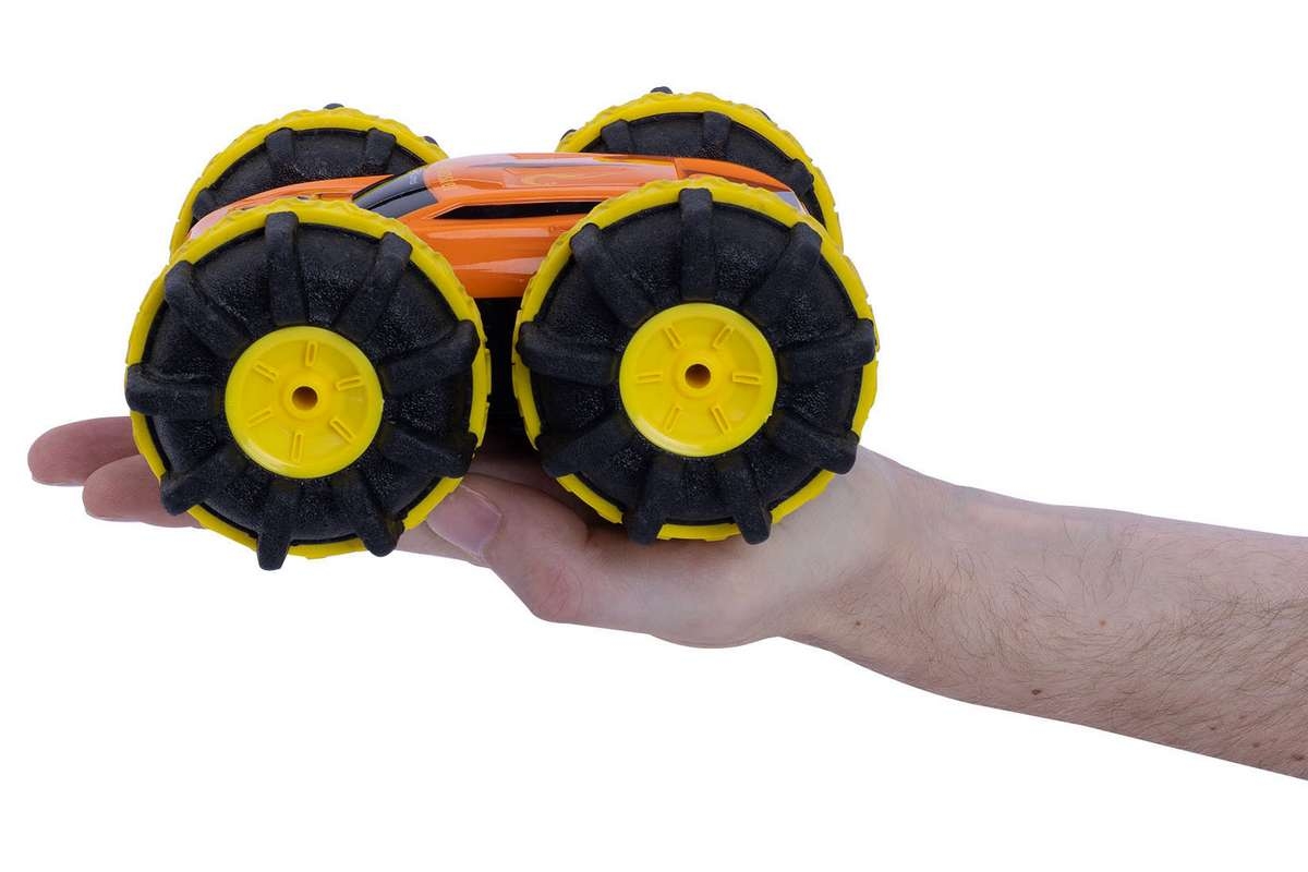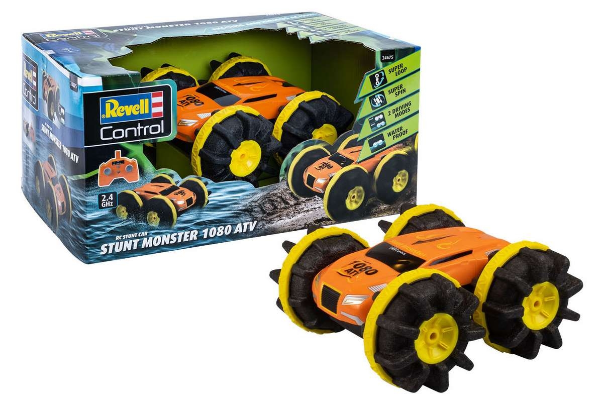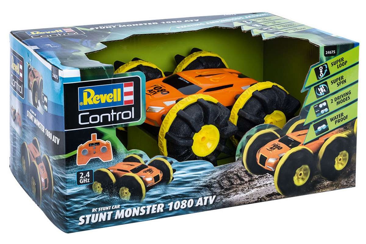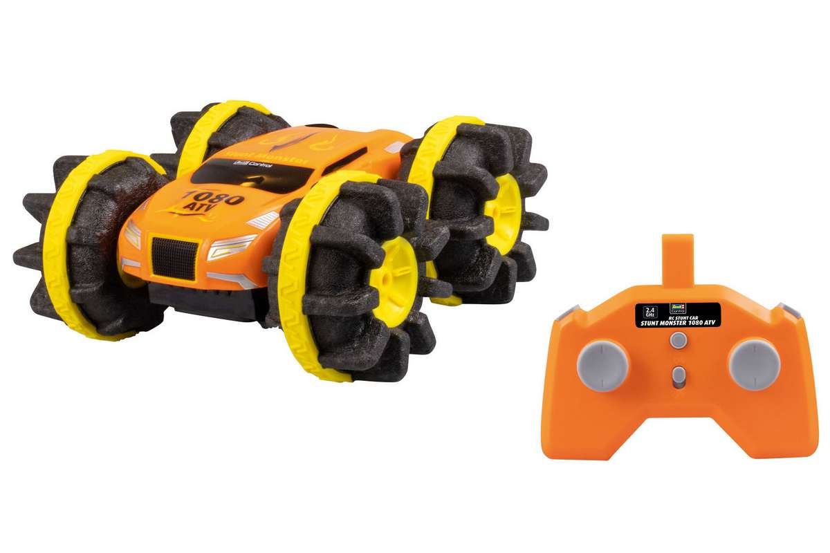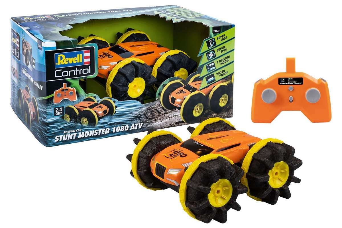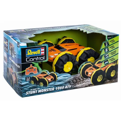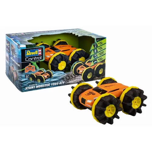 Tiden har kommit! Revell Control Stunt Car 1080 kan nu även köra på vatten! Med Stunt Car Monster 1080 ATV kan alla fans från 8 års ålder uppleva massor av stuntbilaction. Oavsett om 360° snurrar och 360° flips på land eller actionfärd på vattnet med ATV:n är allt möjligt. Den kraftfulla fyrhjulsdriften gör det möjligt att övervinna alla hinder. Fjärrkontrollen på 2,4 GHz säkerställer exakt kontroll och den robusta konstruktionen garanterar mycket körglädje. 1080 ATV är perfekt för stuntförare i alla klasser.