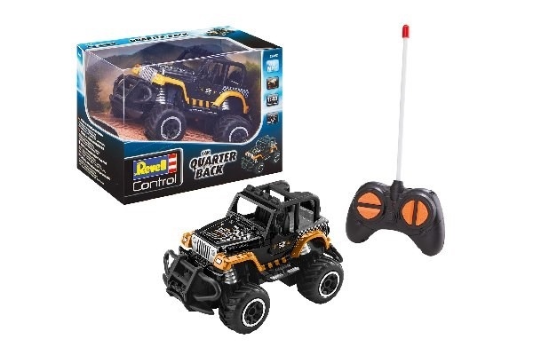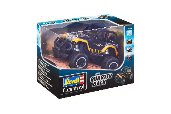 Även vid full gas kan Revells SUV Quarter Back enkelt klara alla hinder, stora som små! Detta beror på den kraftfulla elmotorn samt den precisa och praktiska 2CH MHz fjärrkontrollen. De stora däcken, stötfångare och häftiga designen betonar kraften hos dessa bilar. Inte nog med att att Quarter Backen ser bra ut under dagen, när mörkret faller på fortsätter bilen att se cool ut i mörkret tack vare LED-underbelysningen.