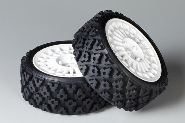 The kit also includes separate parts to depict the side mirrors and roof spoiler. Stickers recreate the markings, including the famous Martini Racing stripes. The model runs on the shaft driven 4WD TT-02 chassis, and comes complete with rally block tires to allow it to drive on road or flat dirt.