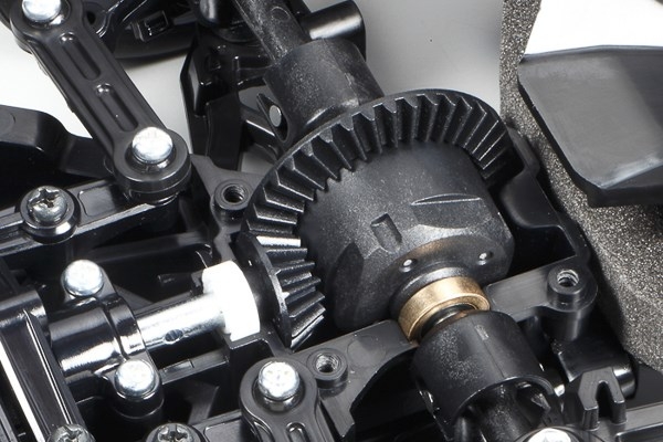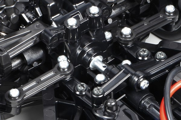 The shaft driven 4WD TT-02 chassis employs a longitudinal layout with the battery on the left and the motor on the right, to offer excellent stability. In addition, it features identical left and right suspension arms and uprights for ease of assembly, plus easy-to-maintain gearboxes.