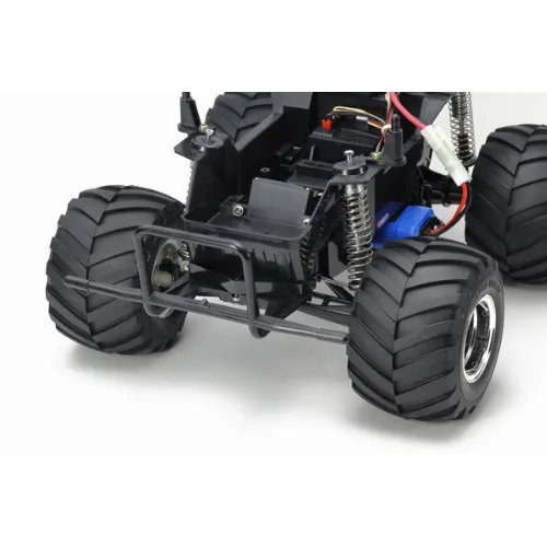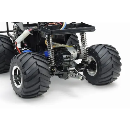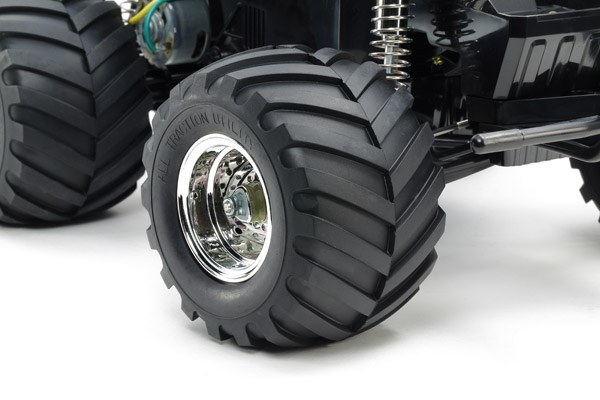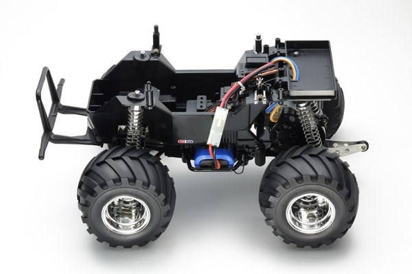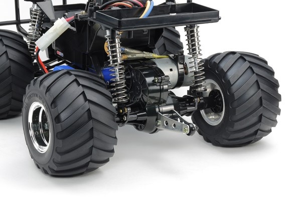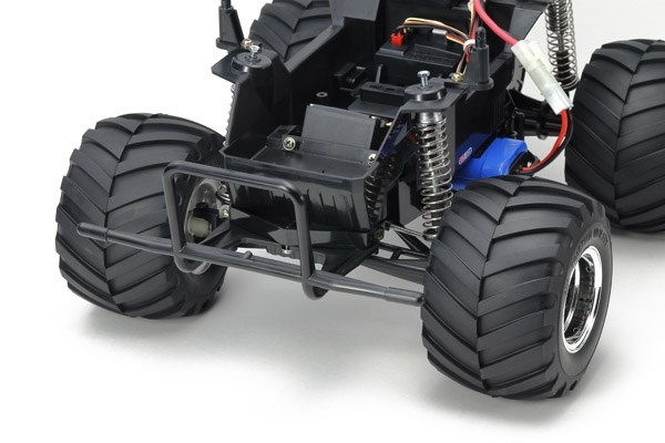 The simple and tough chassis features a rear-mounted motor for realistic rear wheel drive and a strong box frame. Front independent swing arm and rear rolling rigid coil spring suspension system is matched with gigantic 115mm diameter tires that lets this truck trample anything in its way. Gearbox is sealed to protect from dirt and debris, and the truck even has a wheelie bar to let you feel like you are driving a real monster truck.