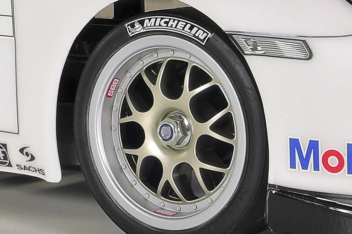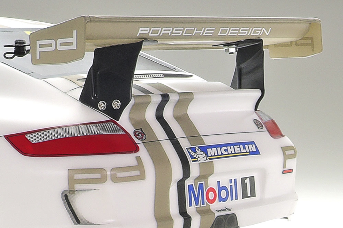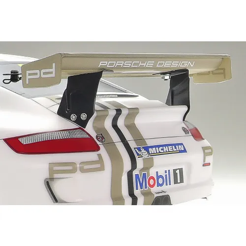 The VIP car recreated by this assembly kit was run by Porsche themselves and was driven upon invitation by a different driver according to the race. Its powerful form and rear wing are recreated expertly in durable and lightweight polycarbonate, with separately molded side mirror parts, plus metal-plated light cases that allow the installation of separately sold LEDs front and rear.