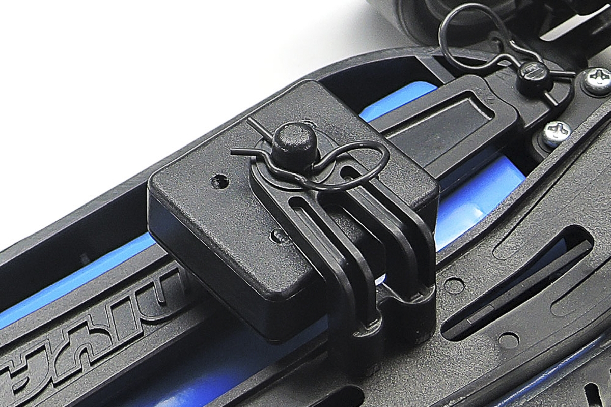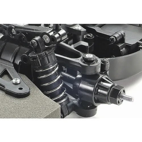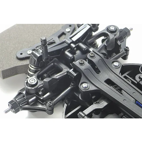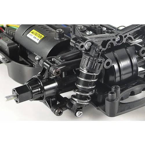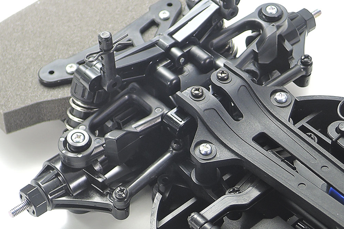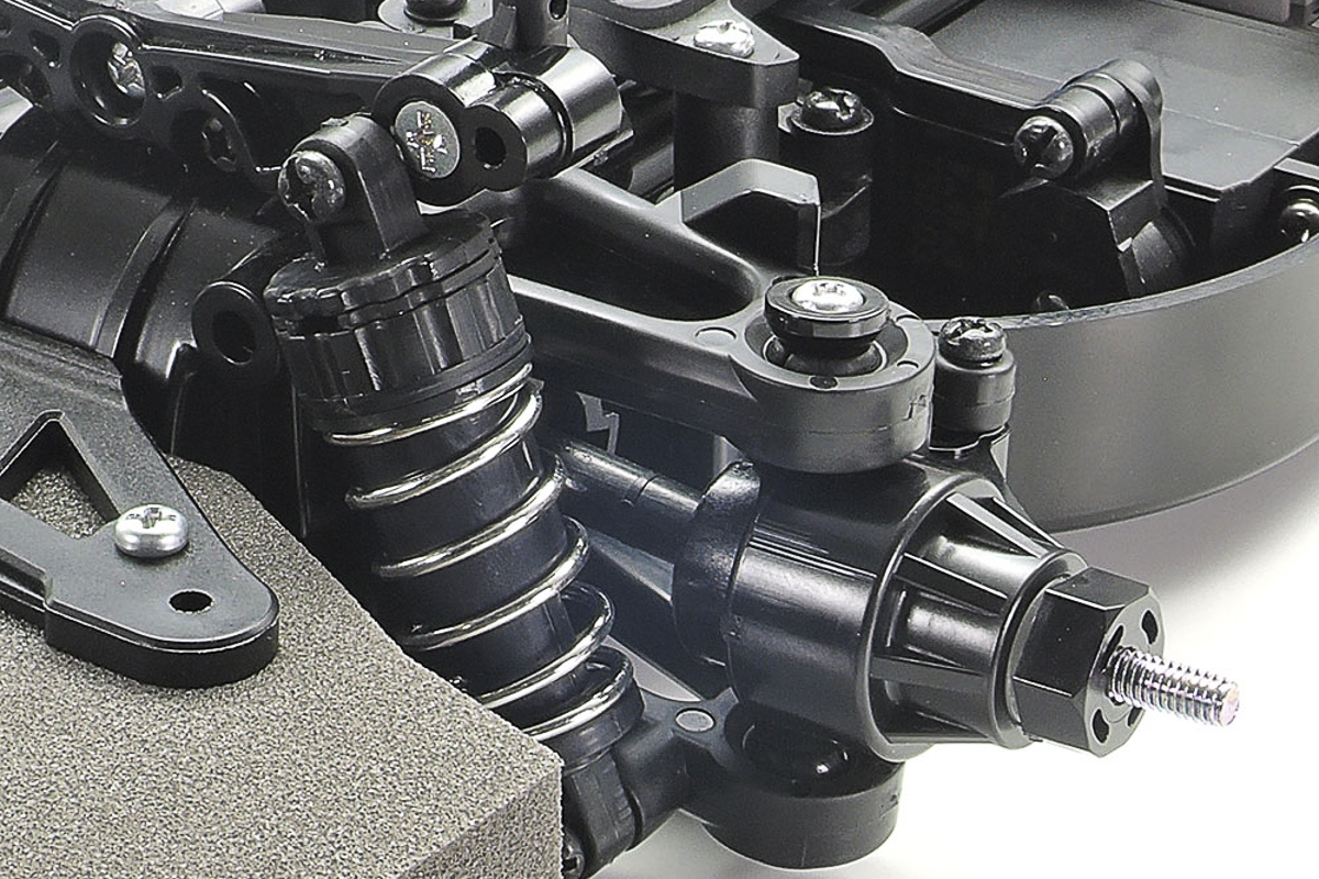 The bathtub frame of the evolved shaft-driven 4WD TT-01 Type-E has its motor and battery close to the ground for lower center of gravity and optimum balance. Mounted on the bathtub frame is a fiberglass reinforced nylon upper deck and gear covers improving rigidity, as well as a three-piece tie rod providing smooth steering action.