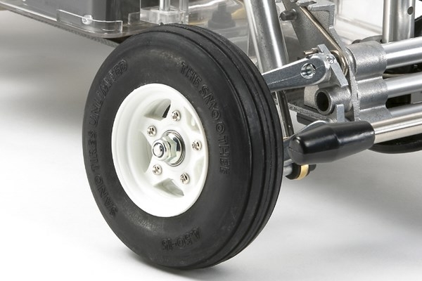 Chassis features a 2mm thick FRP plate with an aluminum reinforcing plate for strength and flexibility to ensure stability. 4-wheel independent suspension features front double trailing arm and rear swing axle setups, die-cast suspension arms, and oil dampers.