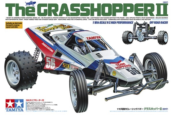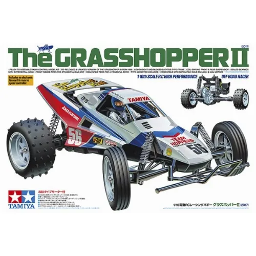 This re-release version of The Grasshopper II R/C off-road car assembly kit features a number of updates while keeping largely to the design of the original released in 1988. It includes a highly realistic injection molded polystyrene resin body, marking stickers and a driver figure.