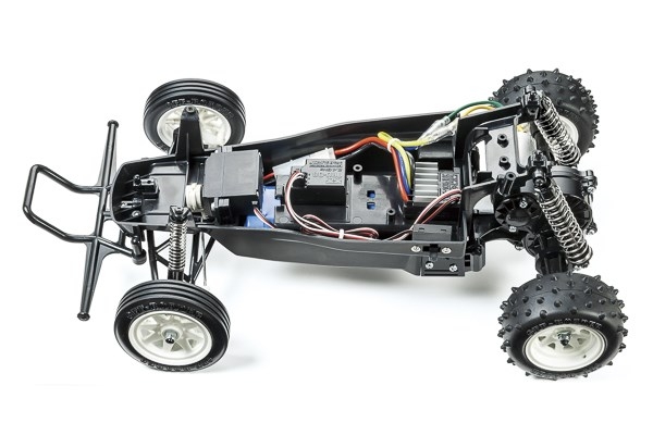 A rugged ABS resin chassis is more than up to the stresses of off-road driving, and features lightweight durable plastic suspension arms, gearboxes and so on - the result is a lightweight and durable unit. Front swing axle and rear rolling rigid suspension combine for a responsive drive, while a fully enclosed gearbox is integrated with the rear axle and has a built-in differential gear to aid smooth cornering. One-piece wheels are paired with front grooved and rear spike tires for solid performance.