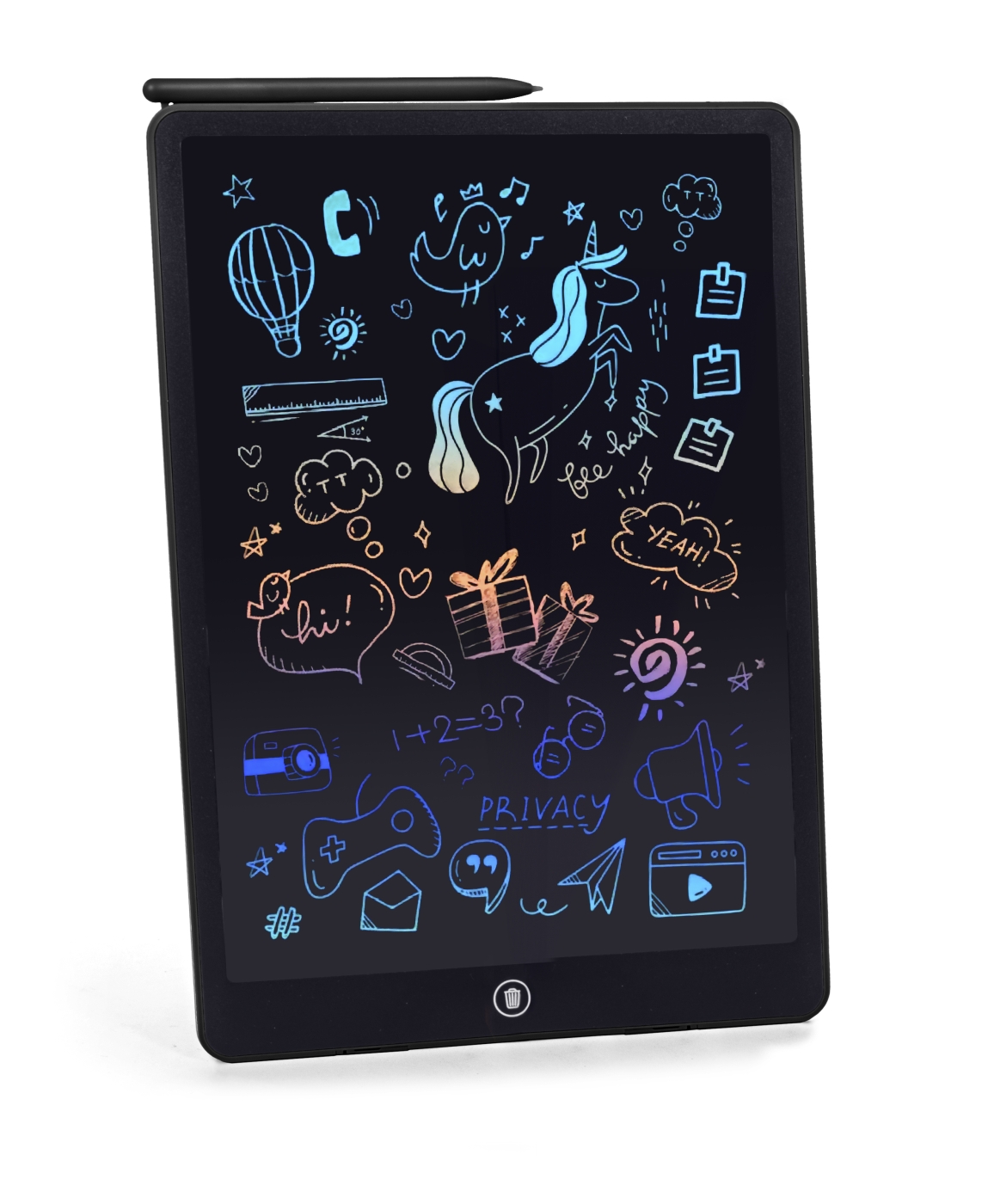 LCD-ritbräda 34,5x23 cm. 16 digital whiteboard med färgbakgrund. Skriv och rita med den medföljande pennan och radera allt igen genom att trycka på raderingsknappen. Du kan också låsa din ritning så att den kan sparas till senare. Inkl. 1 knappcellsbatteri.